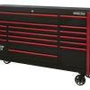 Extreme Tools 33 In. 4 drawer deluxe tool cart with bumpers. The drawers have 3-segment, quick-release ball bearing slides, 100 Lbs. per set of slides. There are 4 mag wheel casters (6 In. x 2 In.) that lock and swivel.