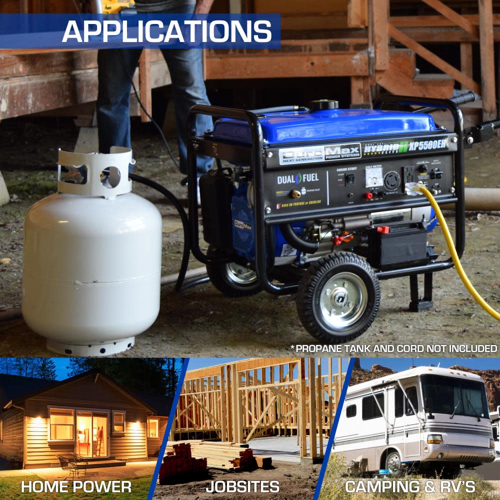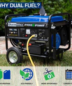 DuroMax??s XP5500EH Dual Fuel portable generator is designed as a powerful user-friendly unit that provides 5,500 watts of power using gasoline or liquid propane. Perfect for running household appliances and powering the jobsite. This Dual Fuel workhorse packs a punch and will keep you powered at home, at work, and at play. EPA and CARB approved for use in all 50 states, the XP5500EH offers the freedom and flexibility of fuel choice. With its 4-gallon fuel tank, this unit will run 8 hours on a single tank of gas or even longer on propane. Enjoy safe, reliable power whenever and wherever you need it. Compared to gasoline, liquid propane lasts longer, costs less, has a longer storage life and won??t gum up the carburetor. The generator??s flexible line allows you to hook up to any size propane tank. The XP5500EH features an electric ??rocker start?? and easy recoil pull start. This unit is durable enough for construction sites and super portable, perfect for tailgating or camping. 5,500 watts provides the power to run lights, TVs, a refrigerator, or any other necessary items during a power outage. The power panel features a volt meter, circuit breakers, low oil indicator, and DuroMax??s exclusive MX2 RV switch that harnesses the generators full power, by combining the two 15-amp 120-volt circuits into one 30-amp circuit ?C doubling 120-volt power for heavy loads like commercial power tools, electric pumps, small air conditioners, and your RV??s demanding power needs. Engine noise is reduced by a super quiet muffler and cushioned 4-point motor mounts, allowing for relatively quiet usage in public areas like campgrounds, parking lots, and parks.
