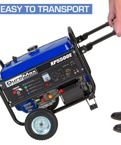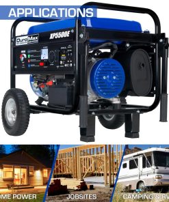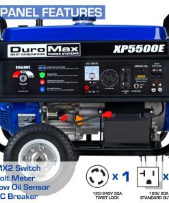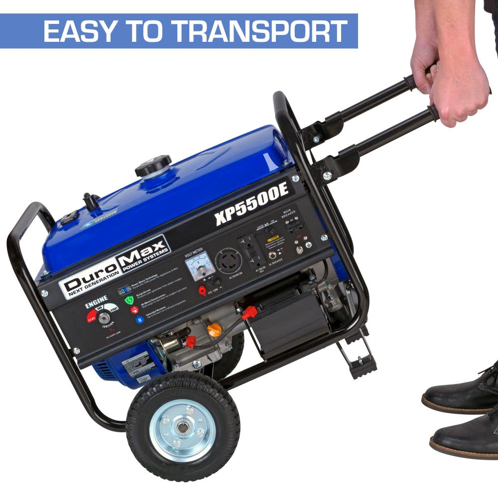 DuroMax??s XP5500E portable generator is designed as a powerful user-friendly unit that provides 5,500 watts of power using gasoline. Perfect for running household appliances and powering the jobsite. This workhorse packs a punch and will keep you powered at home, at work, and at play. EPA and CARB approved for use in all 50 states, the XP5500E is ready to provide safe and reliable power whenever and wherever you need it. With its 4-gallon fuel tank, this unit will run 8 hours on a single tank of gas. The XP5500E features an electric ??key start?? and easy recoil pull start. This unit is durable enough for construction sites and super portable, perfect for tailgating or camping. 5,500 watts provides the power to run lights, TVs, a refrigerator, or any other necessary items during a power outage. The power panel features a volt meter, circuit breakers, low oil indicator, and DuroMax??s exclusive MX2 RV switch that harnesses the generators full power, by combining the two 15-amp 120-volt circuits into one 30-amp circuit ?C doubling 120-volt power for heavy loads like commercial power tools, electric pumps, small air conditioners, and your RV??s demanding power needs. Engine noise is reduced by a super quiet muffler and cushioned 4-point motor mounts, allowing for relatively quiet usage in public areas like campgrounds, parking lots, and parks. Idle control automatically lowers the RPM??s when the generator is not in use, reducing noise and saving fuel. No-flat, semi-solid tires make for smooth and easy transportation. Like all DuroMax generators, the XP5500E is built with all copper windings, which will last you for years, and is covered by a 3-year factory warranty.