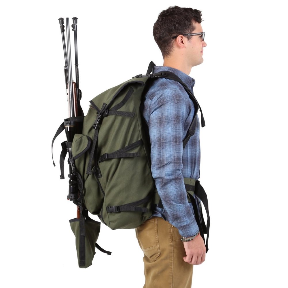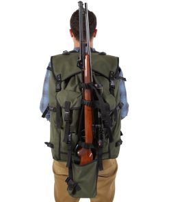 The Quiet Mountain Rifle Pack contains no metal hardware to maximize stealth while hunting, and has all of the benefits of our Bushcrafter Pack with the added convenience of straps and pockets to carry your rifle! Slip the butt of the rifle into the canvas sleeve, and use the straps to secure the rifle to the pack. With the added support of the adjustable sternum strap and removable waist belt, you will be able to navigate through the woods hands-free and stable. Hiking into camp or through the woods is made easier with this convenient and durable pack.