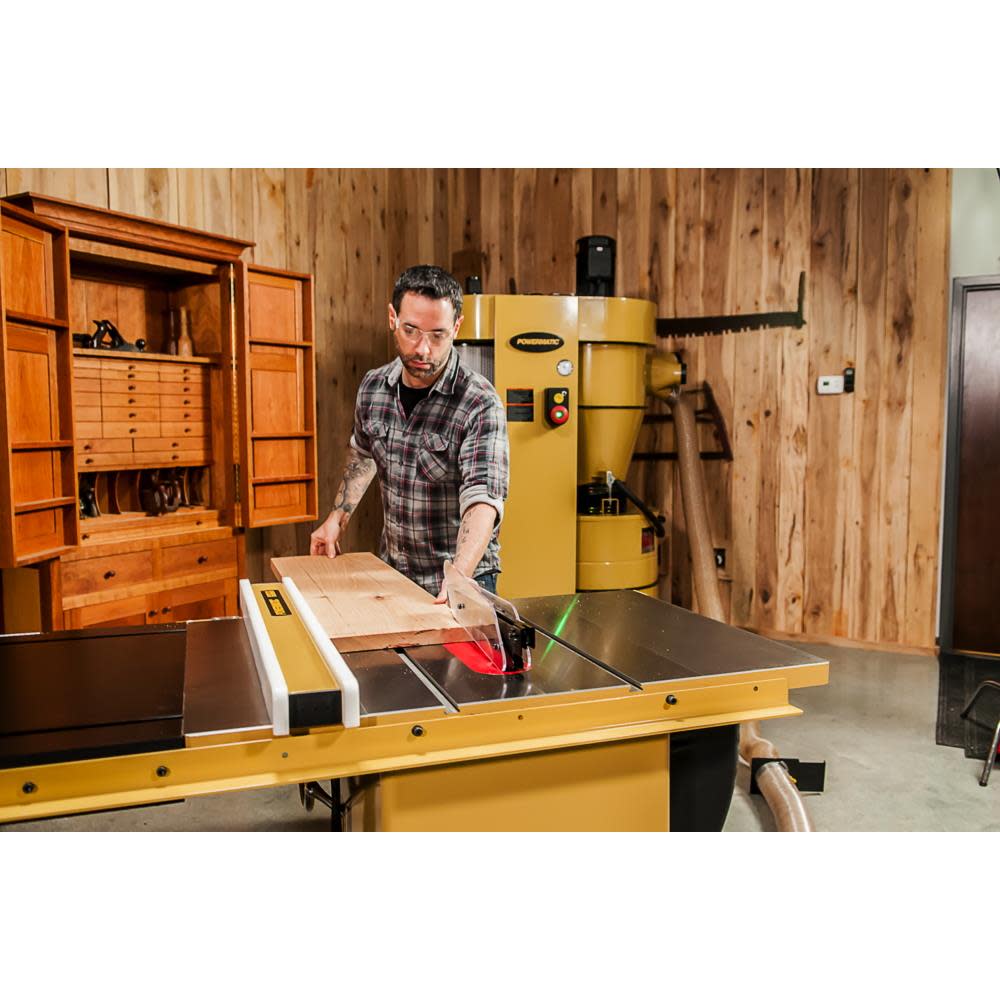 The award winning PM2000 table saw sets a new standard for innovation with an array of patented features and massive body design. The cast iron tables are oversized, and the newly designed arbor lock lever is accessible from above the table top to eliminate the need for dual arbor wrenches. The quick-release riving knife design helps reduce the chance of kickback. The blade tilt scale features an integrated digital read out as well as adjustable angle indicators for repetitive bevel cuts. The newly designed integrated retractable hydraulic caster system mobilizes your table saw much higher than the previous model to assist when moving over thresholds. A wide stance, heavy-duty box trunnion and concave teeth on the trunnion gears promote easier raising and tilting of saw blade. Poly-V drive belt system results in quieter, more efficient power transfer from the motor to the arbor with virtually no vibration and less heat build-up. Improved built-in dust collection port with convenient access to the inside of the saw cabinet for simple clean-up. The saw has a proprietary safety switch with magnetic interlock and the stop button can be knee activated.