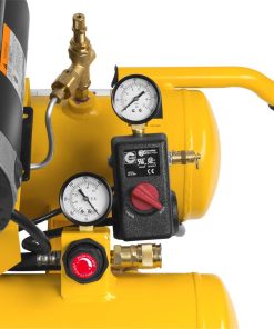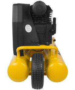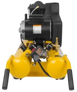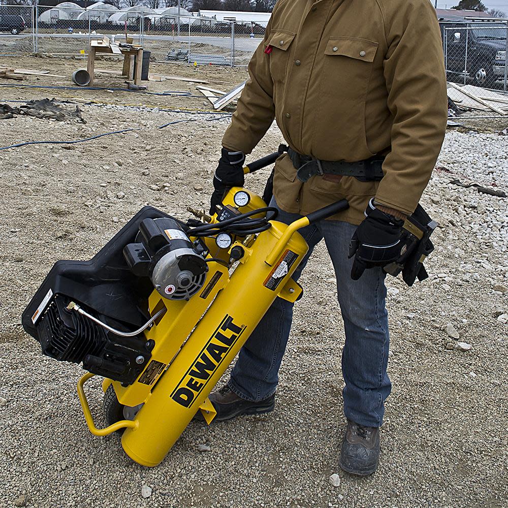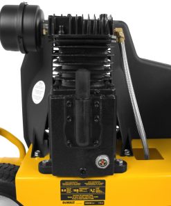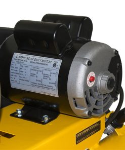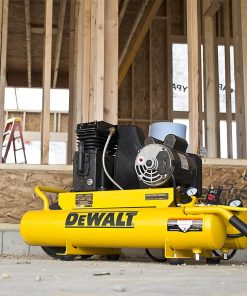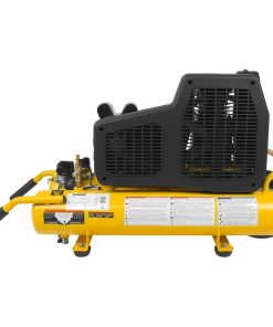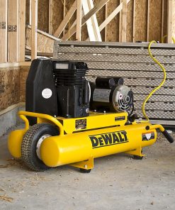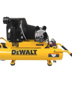 The Dewalt 8 Gallon wheelbarrow air compressor has a powerful and reliable 1.9 HP heavy-duty induction motor, helping to ensure trouble-free operation with an easy start and the ability to drive high-pump performance. The cast iron, twin cylinder pump with a thermally stable cast iron twin cylinder body and valve plate delivers a surge of air power and recovery needed to run extra nailers. A fully enclosed metal belt guard covers and protects moving parts, while a ball drain valve allows for quick and thorough tank draining.
