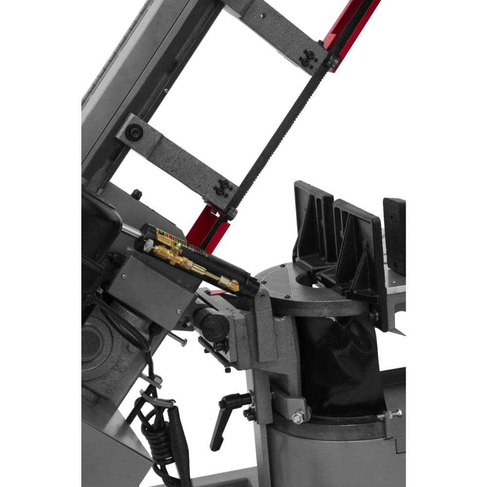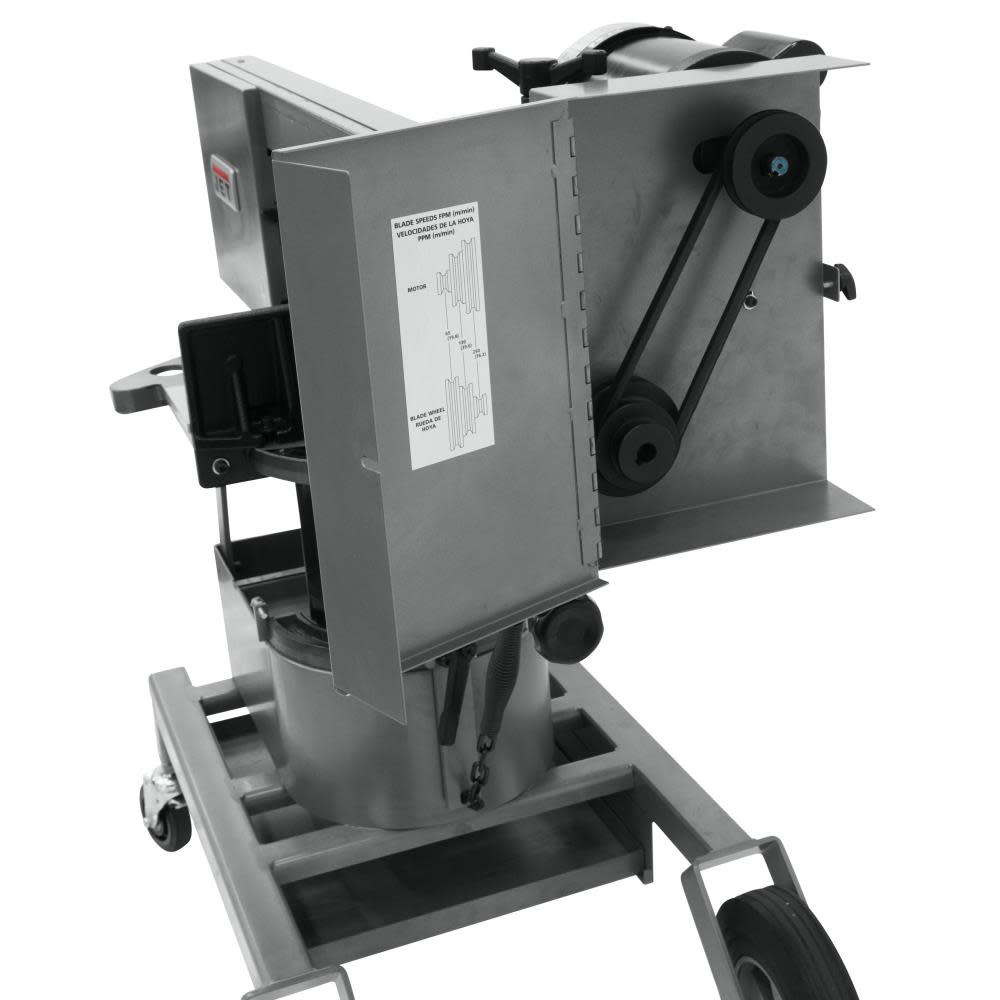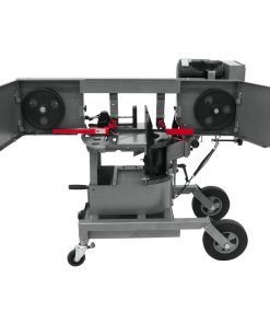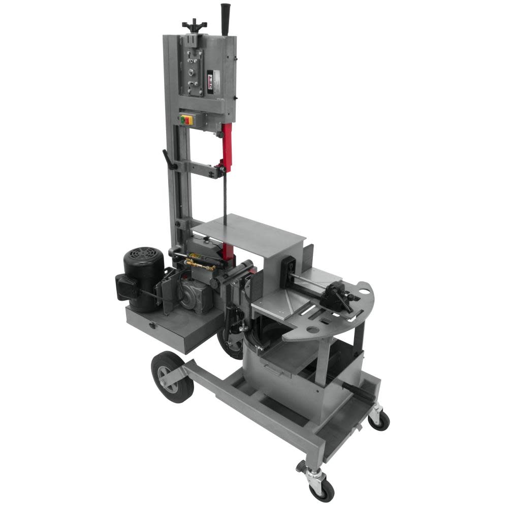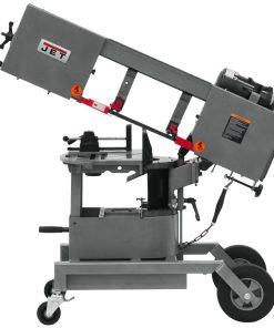 Jet dual-mitering band saw offers versatility and ease. The unique head design miters both left and right, allowing for quick angle cuts. Add to the convenience with easy conversion from a horizontal to vertical position, and wheels for moving around the shop floor.