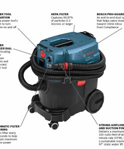 The Bosch VAC090AH 9-Gallon Dust Extractor with Auto Filter Clean and HEPA Filter provides a complete package that is designed to help users move toward compliance with the OSHA silica dust regulation. The dust extractor delivers a maximum 150-cubic-feet-of-air-per-minute rate (CFM), with a sustainable 97 In. static water lift (maximum). The automatic on-board filter-cleaning system activates every 15 seconds to help maintain maximum suction power. The included HEPA filter captures 99.97% of particles at 0.3 microns and larger. The included fleece filter bag helps to protect the filter and provides the optimal containment of dry dust and debris. The dust extractor also has power tool activation that allows the tool to activate the vac and a Power Broker dial to match the suction force to application.