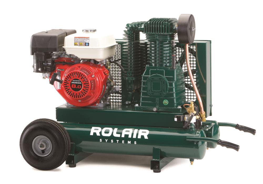 Rolair twin-tank compressor includes Honda engine, durable wheels and belt adjustment device