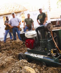 The ROLAIR? 9-Horsepower Two-Stage Two-Cylinder Portable Gas Compressor delivers enough pneumatic pressure for all your industrial power tools. This device expels air at 20.1 cubic feet per minute (CFM) at 90 pounds per square inch (PSI). It uses gasoline for power so it can pressurize air without any significant delay before you get started on the job. This Rolair air compressor comes with two cast-iron cylinders that withstand high pressure levels and wheels to support the unit’s 286-pound weight. It shuts off automatically when oil levels fall too low and protects itself from extensive fuel usage with a built-in idle system. The 9-horsepower air compressor relies on a Honda engine for its speed and efficiency, and it has a retractable starter that protects against accidental engagement.