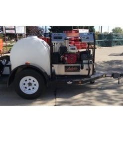 The Entrepreneur II mobile wash system with the 42-430H-C Pressure Washer is a quality mobile wash system at the top of its class. The 5 ft x 8 ft trailer is constructed of heavy wall steel tube frame utilizing sealed beam lights with the wiring inside the tube frame to reduce exposure to the elements that cause premature light failures. The deck is completely covered to also reduce road dirt and splash from below the trailer keeping the pressure washer, water tank, and hose reels clean longer. The Aaladin 42 series pressure washer is a great hot water pressure washer with a Honda GX390 engine rated at 13 HP, 3000 PSI at 4 GPM, and 384,000 Btu. With this mobile wash system you can wash equipment right in the field.