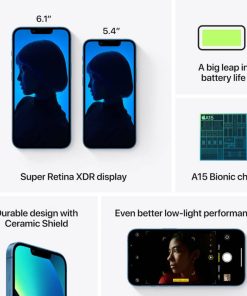Apple iPhone 13 128GB in BlueAre you ready to upgrade your smartphone? The iPhone 13 is Apple’s latest offering and loaded with new features for you to enjoy. Powered by the mighty new A15 Bionic chip, this smartphone is Apple’s fastest, longest-lasting yet. Instantly upgrade your social media pages with the powerful new camera. The diagonal dual-camera system, consisting of the new Wide and Ultra Wide cameras, enhances photos in low-light situations and reveals more detail for incredibly realistic photos. Shaky photos are no longer thanks to the sensor-shift optical image stabilization, which keeps photos sharp and in-focus even when your hands aren’t steady. Love shooting videos on your phone? The new iPhone 13 also features Cinematic Mode, which uses a technique loved by professional filmmakers called rack focus that shifts focus from one subject to another. It can also detect when a new subject enters the scene and shifts the focus accordingly. That way, you can produce short films or social media content that feels as if it were made by professionals. Brighter, Sharper, Faster, StrongerEnjoy edge-to-edge durability thanks to Ceramic Shield, which is tougher than standard smartphone glass thanks to the addition of??you guessed it??ceramic. With greater drop resistance, shattered screens are a thing of the past. The flat-edge design also lends durability while also adding an aesthetic touch. The Super Retina XDR display is another new feature that enhances the viewing experience whether you’re watching a movie or scrolling Instagram: it makes the screen 28% brighter, has enhanced color accuracy and has an ultrahigh pixel density for incredible sharp images. Apple has also reduced the size of the front camera so you can enjoy this stunning new display on a larger screen. For inquiries or more information about the iPhone 13, reach out to our experts over the phone at 800-914-2061 or in person at our Glenview store. Additionally, we have coverage of Apple’s latest product announcements on our blog. Key Features