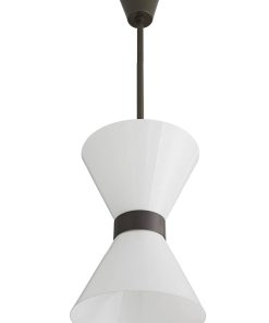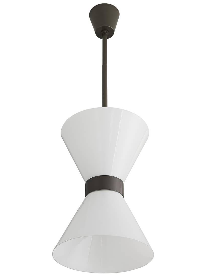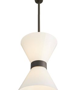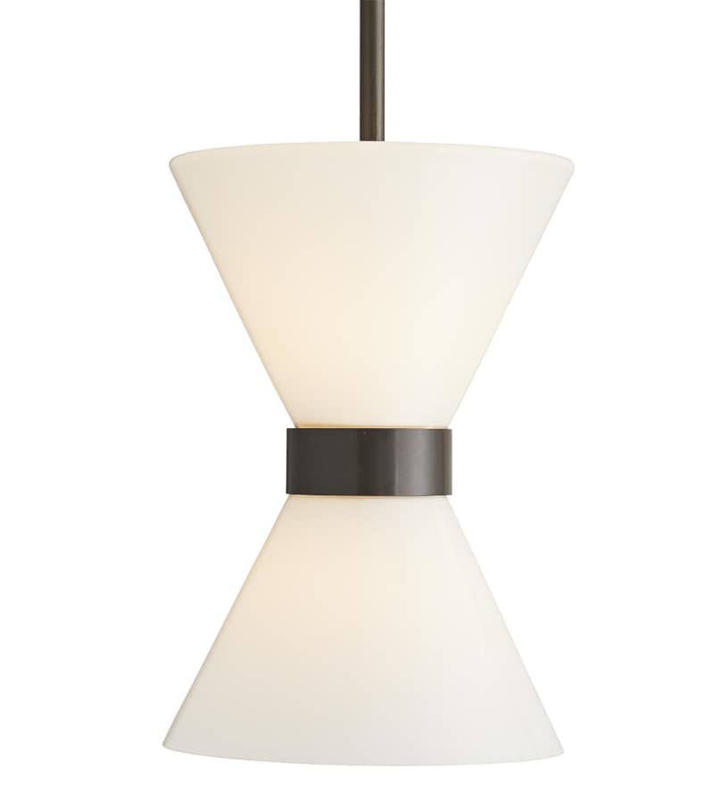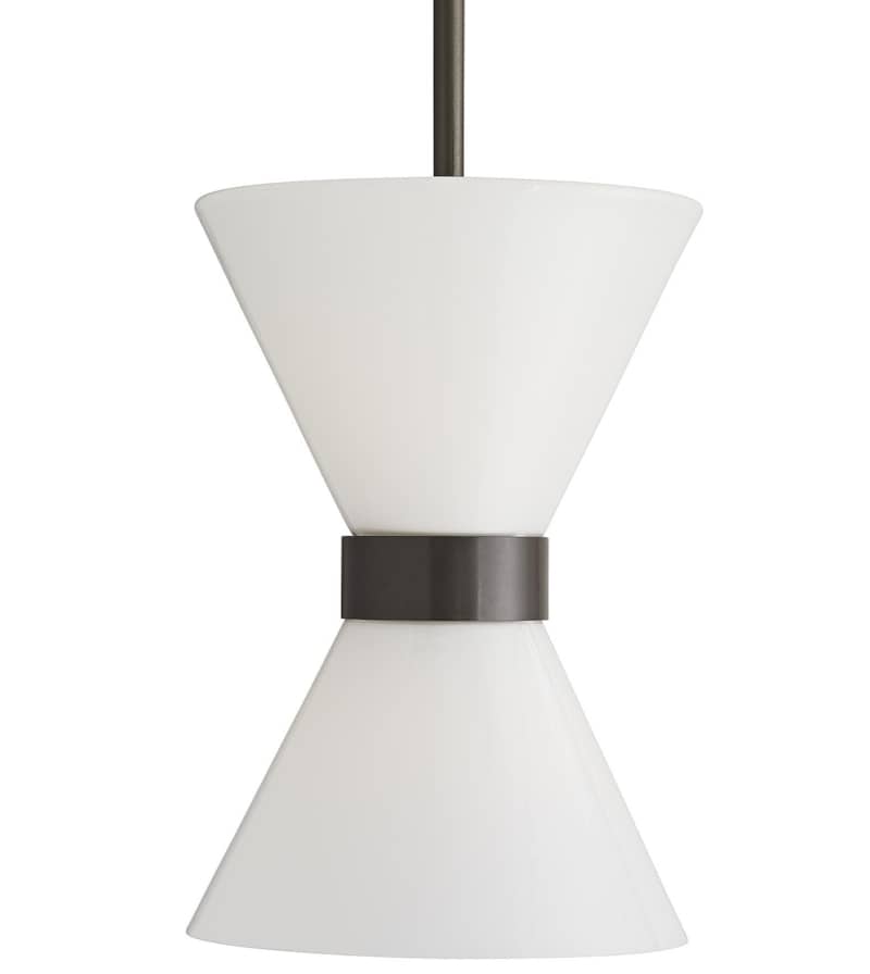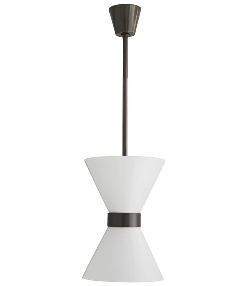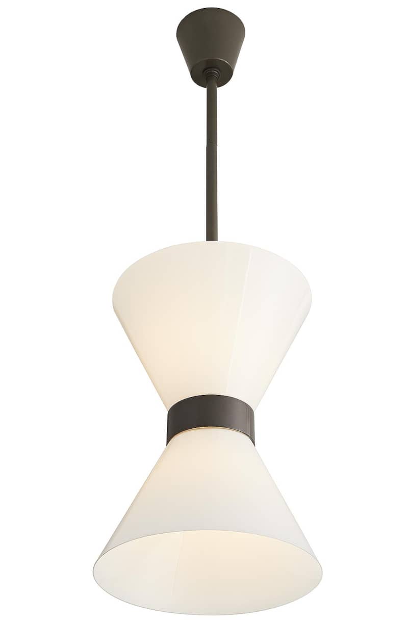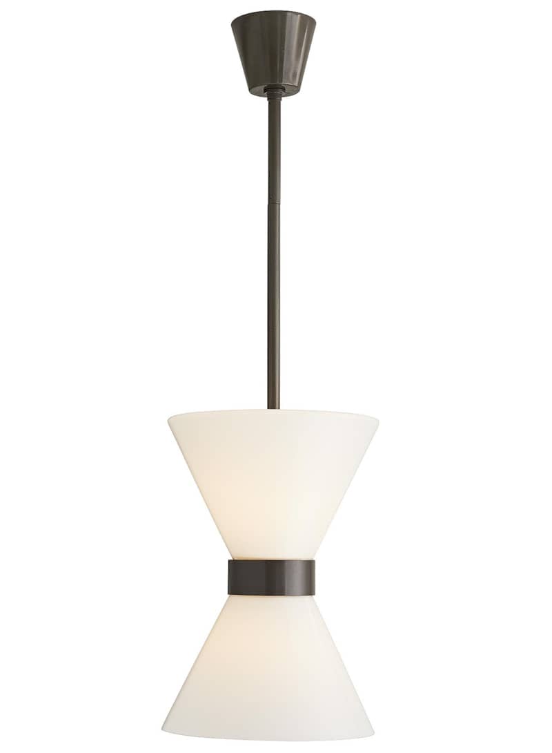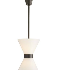 Arteriors 49228 Richard Aged Iron Outdoor PendantThe traditional hourglass shape gets a modern revamp in this contemporary drop pendant. The glow comes from the opal glass shade, which conceals two bulbs??one up and one down??to cast ample, warm light throughout a space. Its linear style is what makes it so modern, though the aged iron finished steel accents also lend an updated look, too. Approved for use in outdoor areas. Additional pipe available PIPE-193. Also available in Aged Brass (49229). Features General