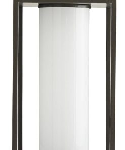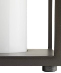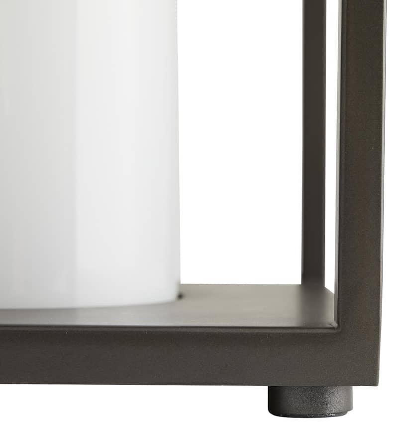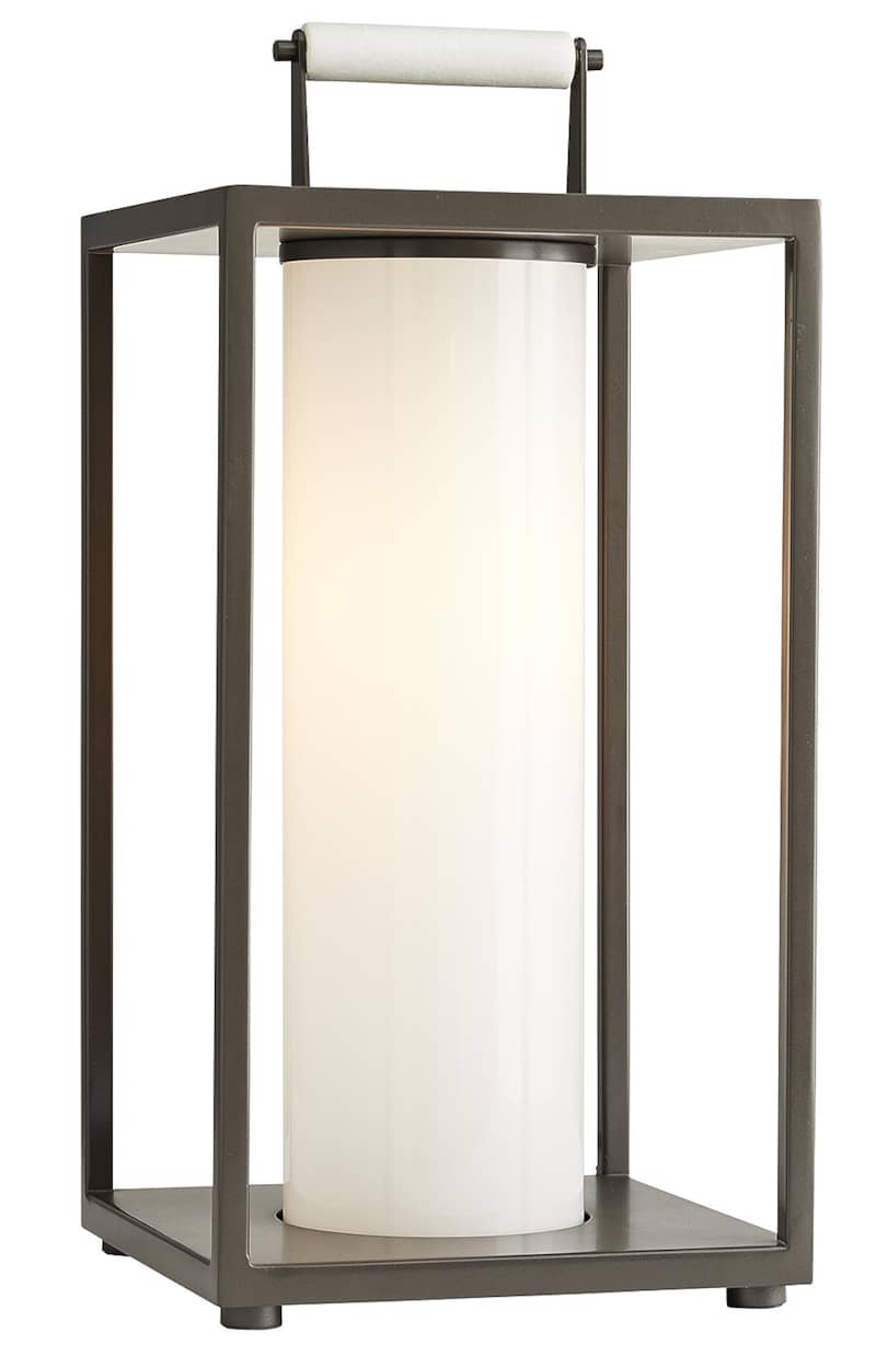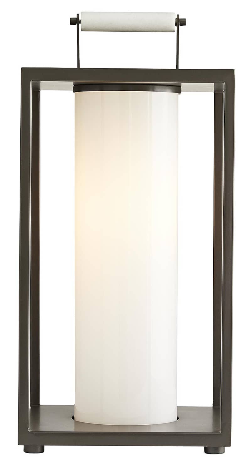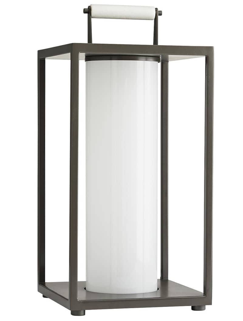 Arteriors 49202 Stetson Aged Iron Outdoor LanternBuilt for the great outdoors, this versatile lantern pairs the resilience of industrial style with a modern aesthetic. The steel frame is finished in an aged iron, so it exudes a debonair attitude, but the clean lines andsimple construction allow it to blend in with any surrounding. The top is fitted with a handle accent, recalling a traditional lantern function, and the bulb is concealed in an opal glass sleeve, casting warm light all around. Also available in aged brass (49203). Features General