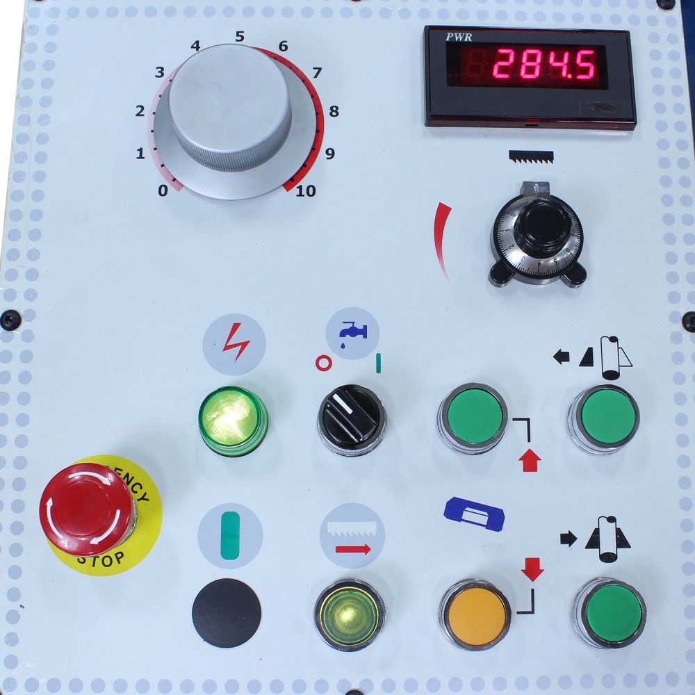 You can adjust the hydraulic descent pressure (depending on the material) to achieve faster cut times and longer blade life