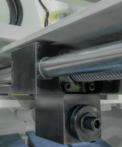 Back gauge positioner rides on a screwball rail system and uses an encoder for accuracy