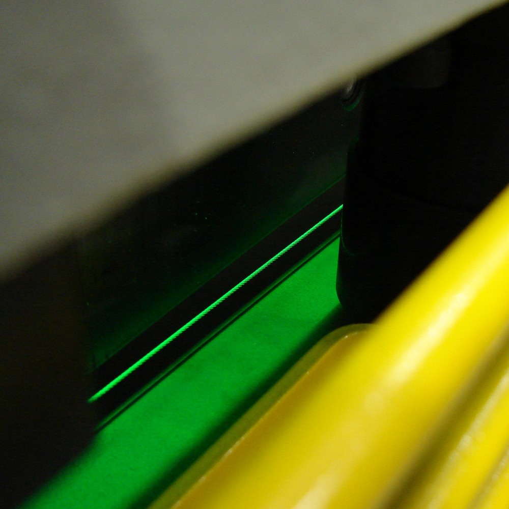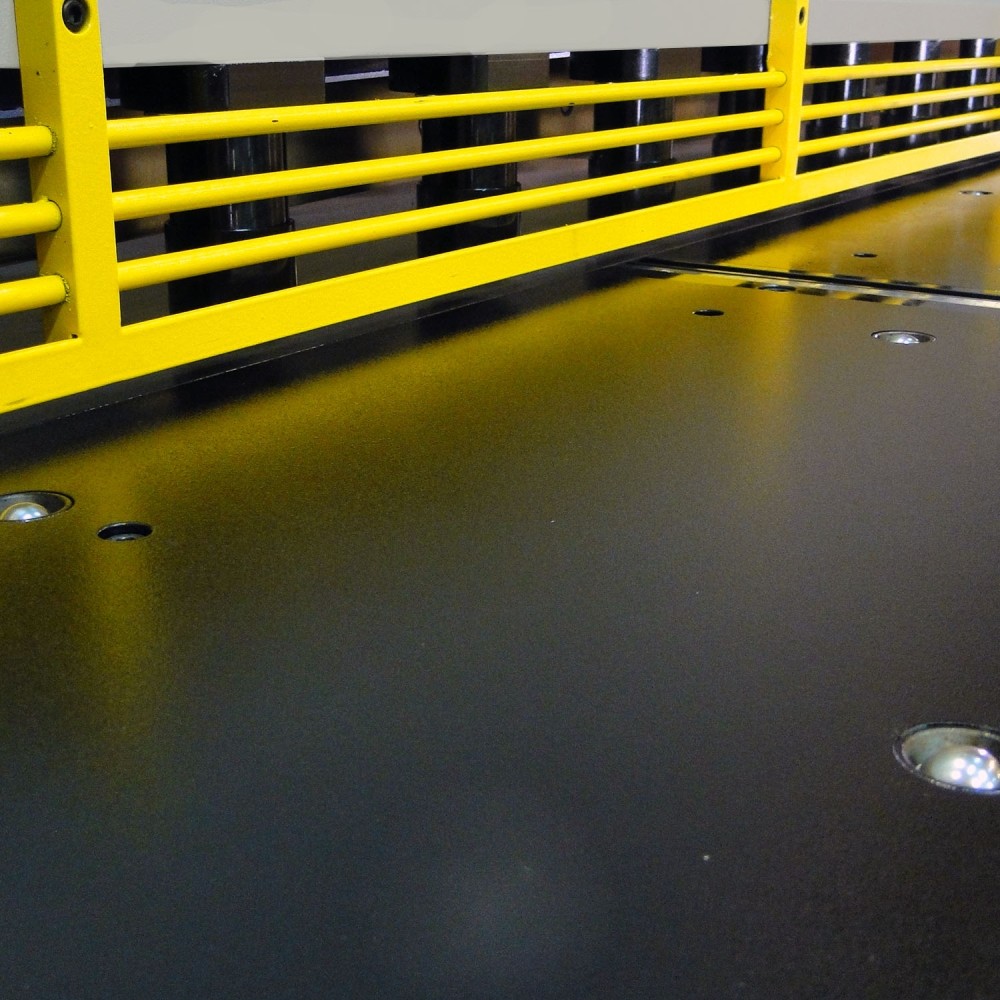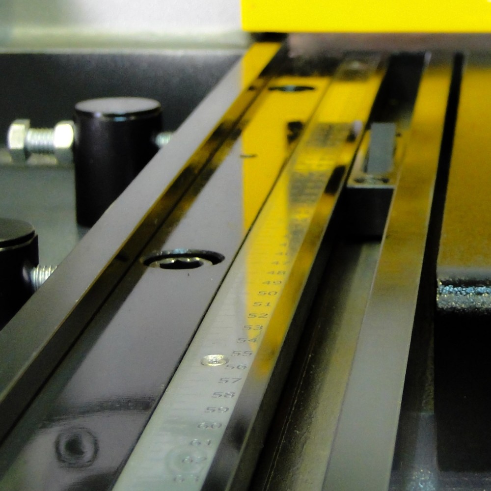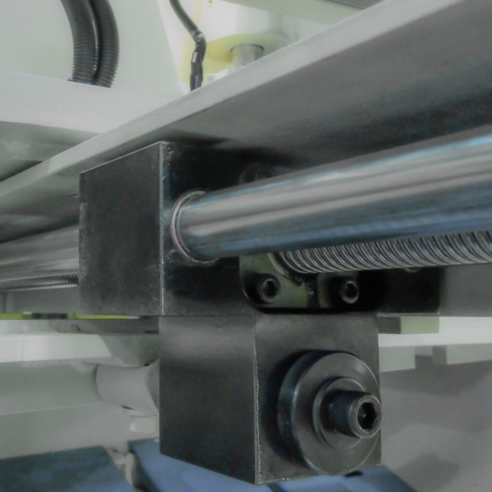 Upper blade carriage rides in a 3-axis bearing housing, Precision ground and hardened rail system offers unbeatable accuracy and longer blade life