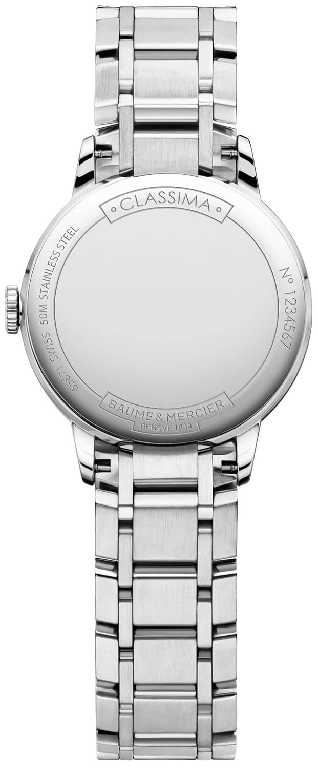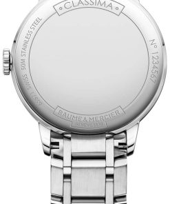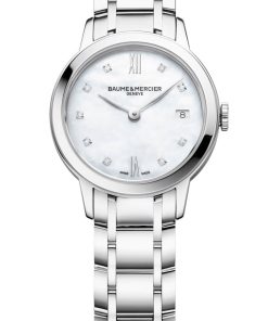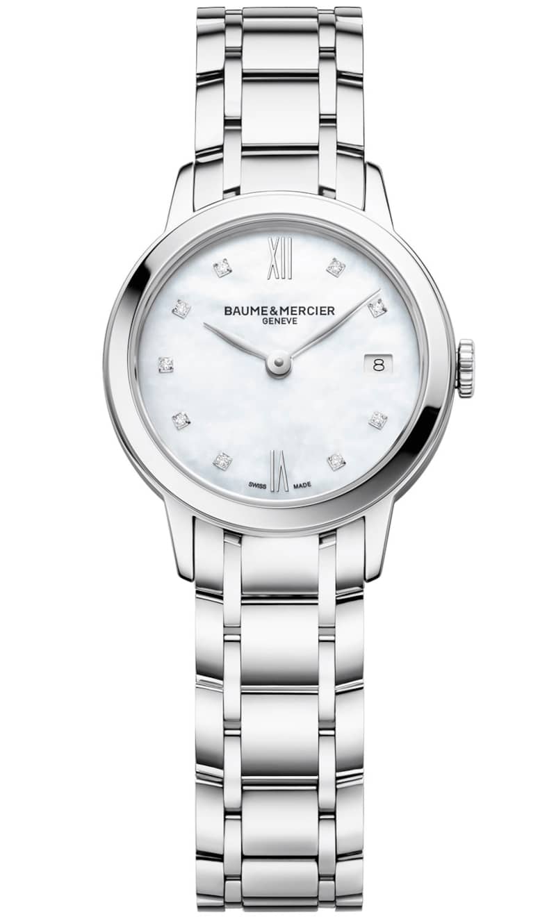 Baume & Mercier 10490 Classima Diamond-Set Mother-Of-Pearl Dial Polished Steel Bracelet Watch, 27mmThis luxury quartz watch for ladies exemplifies feminine grace. It features a mother-of-pearl dial with 9 brilliant cut diamonds as indexes and the date aperture at 3 o??clock. This Swiss timepiece comes with a polished stainless steel bracelet. Specifications Movement