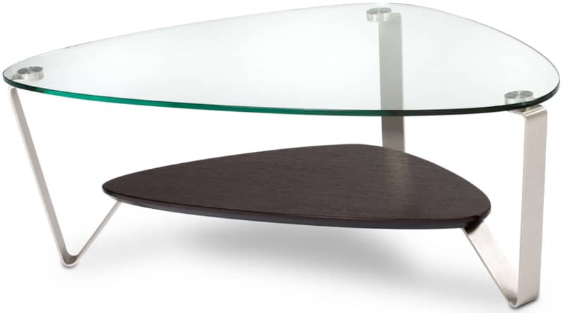 BDI DINO1344ES Dino Small Triangular Coffee Table In Espresso Stained OakA small coffee table that features a soft, triangular shape, making it a versatile choice wherever a smaller footprint is desired. The soft, triangular shape of the Dino 1344 Small Coffee Table coordinates with a variety of upholstery sizes and configurations and is ideal for use with a sectional sofa. Smaller than the larger 1343 model, this table is available in four finishes. The tempered glass top and beveled lower shelf are securely attached to satin-nickel steel legs??partner with the 1347 End Table. Footnotes: