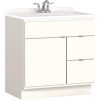 Riverside is a premium construction vanity base. Features veneered slab doors and drawer fronts, full overlay, and a semi-gloss finish. Sides are 3/4 In. veneer core plywood with natural birch interior and hardwood veneer on the exterior. Floors are 1/2 In. natural birch plywood. Back is 1/4 In. veneer core birch plywood. Interior is finished natural birch. Shelves are 1/2 In. particle board core birch plywood. Hinges and glides are soft motion, soft close. Vanity top not included.