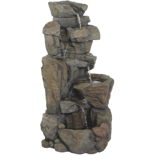 Polyresin fountain with water pump features realistic faux rock that enhances the beauty of any garden or landscape. The cascading effect of the rocks creates a soothing and relaxing sound. Realistic rock color finish. 22 In. L. x 22 In. W. x 42 In. H. Pump included.