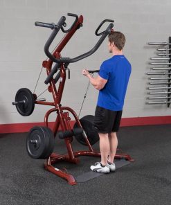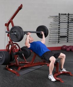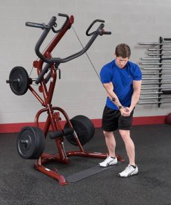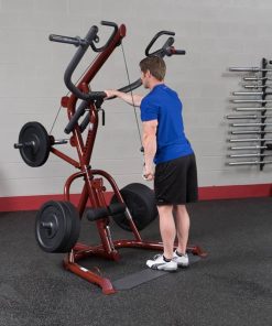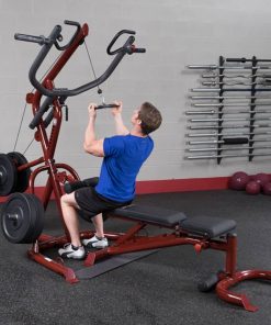 Body-Solid GLGS100P4 Corner Leverage Gym PackagePerform shrugs, squats, dead lifts, biceps curls and everything in-between more easily and effective. With a revolutionary space-saving design the GLGS100P4 fits comfortably into most home and commercial settings. With an all-new, high-tech/high-gloss anodized red finish, this gym not only stands out for its performance but also its looks. The swing arm/press arm station has a large radius to greater simulate a straight up and down motion. The press arm bar can also be raised to its highest position allowing the GLGS100 to be used as a pull-up/chin-up station. An adjustable knee lock-down makes lat pulldowns easier than ever while the low pulley station is perfect for curls and multiple row exercises. Attached weight horns make weight storage easy. The included premium GFID100, Flat / Incline / Decline Bench can slide in and out allowing for ease-of-use and a smooth transition from exercise-to-exercise while attached wheels make transport a breeze. Stand-alone design allows bench to be used completely independently of the gym system. Includes (1) Lat Pulldown Bar and (1) Revolving Cable Handle. Save time and space with the all-new Body-Solid GLGS100P4 Corner Leverage Gym. Features: