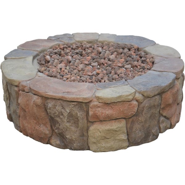 36-inch gas fire pit. Features a pulse ignition. Includes a long lasting stainless steel burner, 10-foot regulator hose, tank seat, lava rocks, and cover. Metal construction with stone appearance. Inner fire bowl diameter: 23.6 inches. Uses 20-pound propane tank, external and not included. 50,000 BTU (British Thermal Unit).