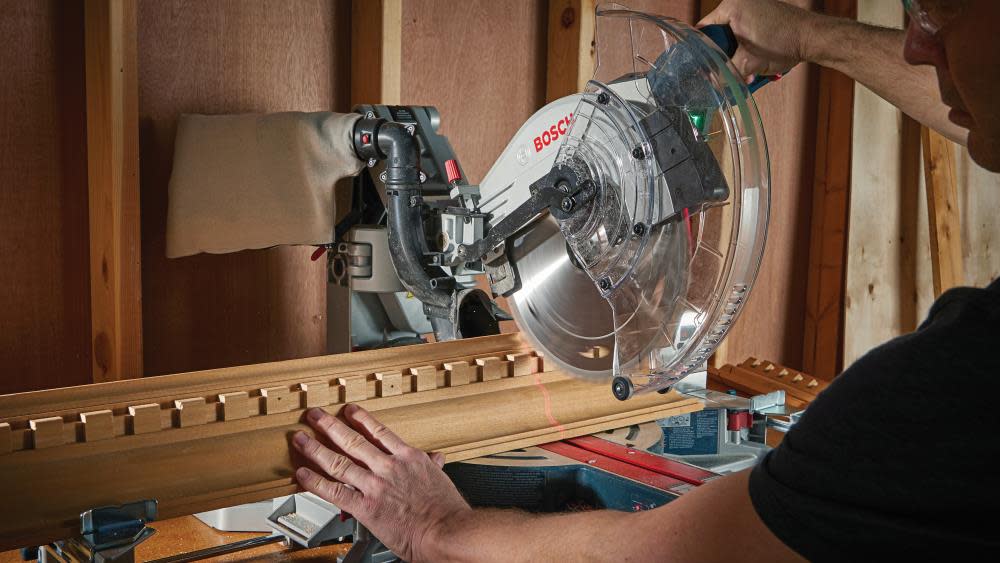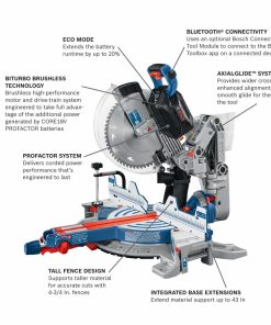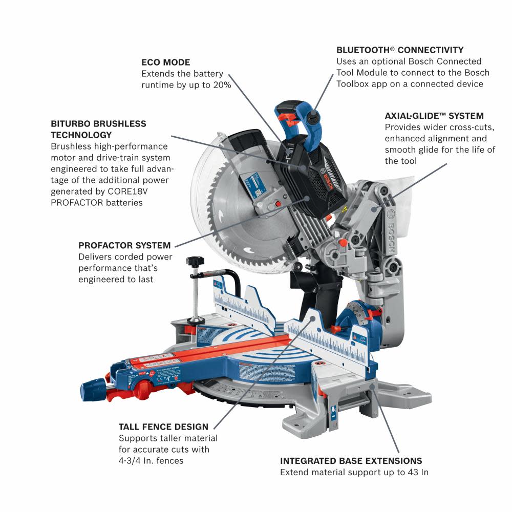 This Bosch Surgeon 12 In. miter saw features the Axial-Glide? System and BITURBO Brushless Technology to deliver a professional cordless solution to the jobsite. The GCM18V-12GDC features the Bosch-exclusive Axial-Glide? for wider cross-cuts, enhanced alignment and smooth glide for the life of the tool. This system features and articulating arm with no slide arms behind the saw, so it takes less space than a sliding-rail miter saw. It delivers a large cutting capacity, with a 4.7 In. depth and a 15.7 In. width/crosscut. The bevel controls are upfront for easy access. This compact saw is portable while being compatible with a variety of 12 In. blades. This miter saw is part of the PROFACTOR System, which pairs BITURBO Brushless Technology with a CORE18V PROFACTOR battery. BITURBO Brushless Technology is a high-performance motor and drive-train system designed to deliver power comparable to high-demand corded tools. It has ECO mode, which extends the battery runtime by up to 20%. The saw features connectivity (module sold separately), providing a link to a connected device via Bosch Toolbox App to customize speed selection and individual mode setting.The saw provides integrated base extensions that extend material support up to 43 In. The 4-3/4 In. tall fence design supports taller material for accurate cuts.