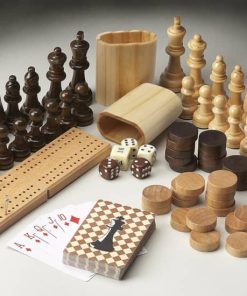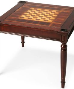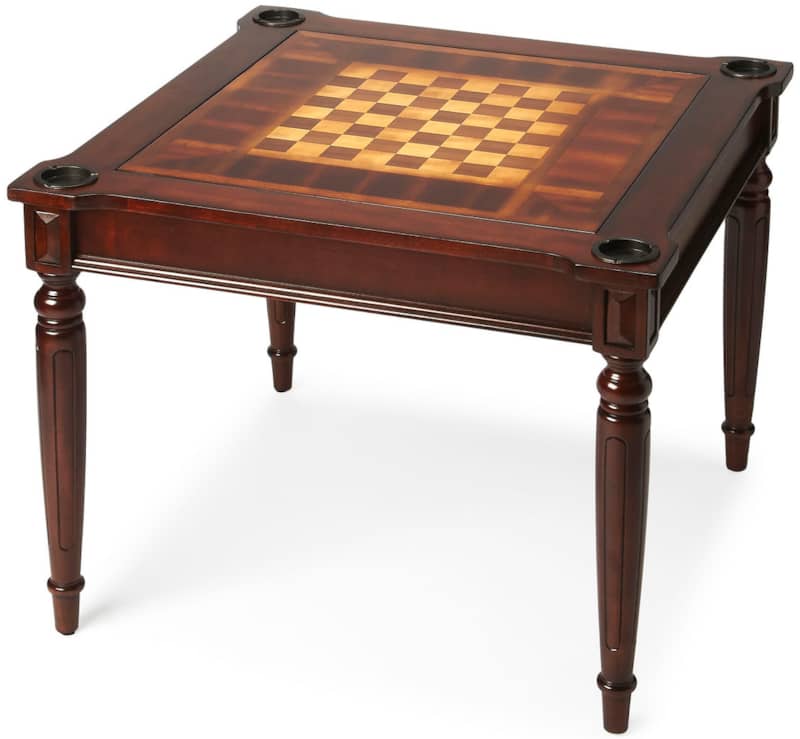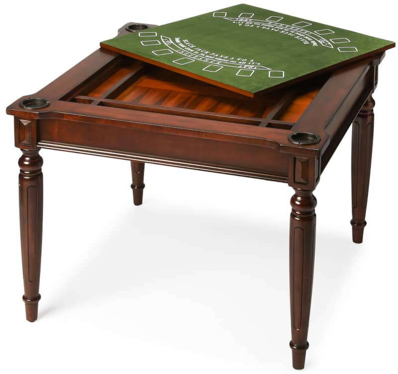 Butler Specialty Company 0837024 Vincent Multi-Game Card Table In CherryPlay a variety of games on this stylish table that is veneered with a Cherry finish. The top inset has a game board for chess and checkers. Flip the inset over and it converts to a green felt-lined blackjack table. Remove the insert altogether and the well (beneath the inset) is a back-gammon game board. Four glass holders on each corner. Chess and other game pieces are not included. Features