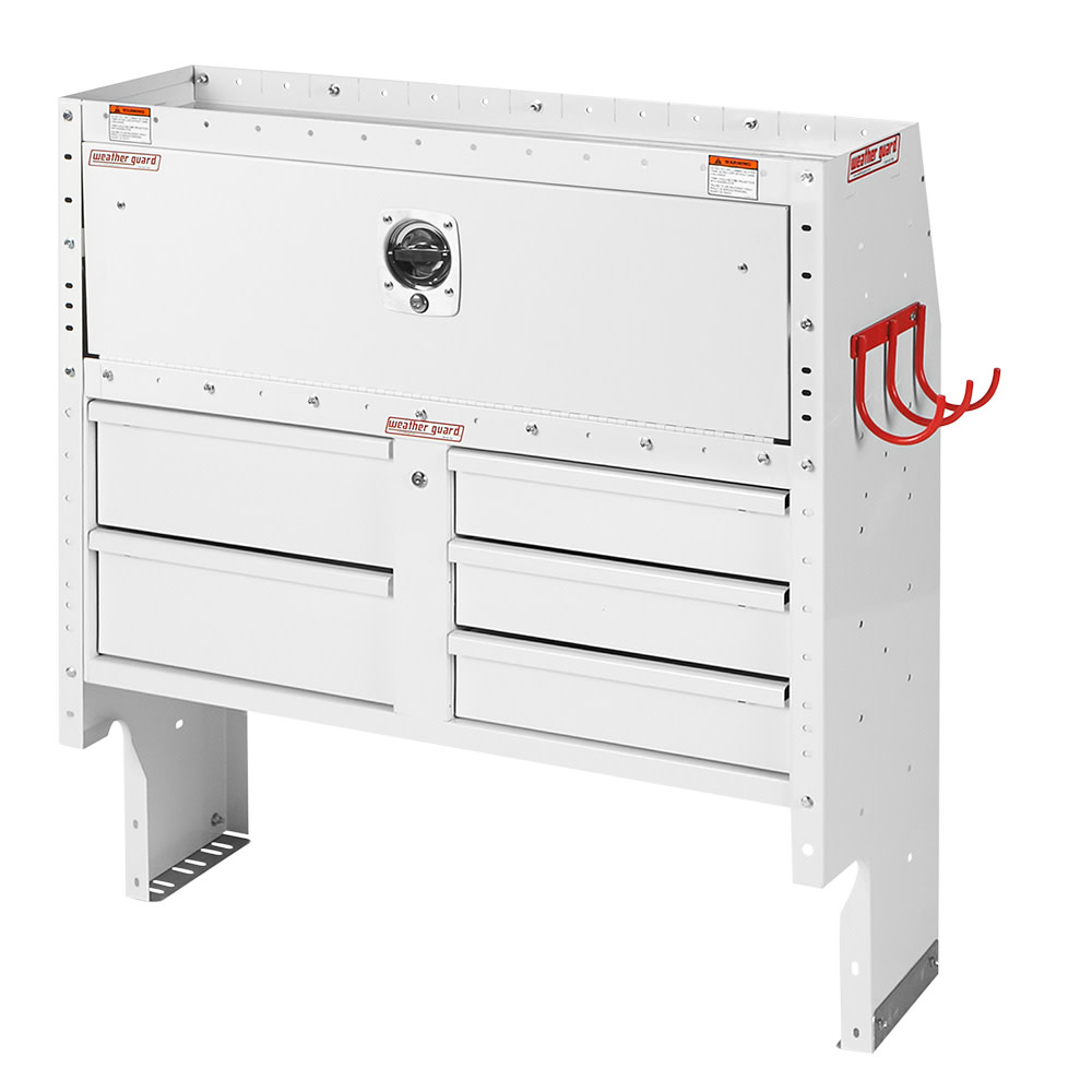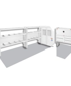 Designed for plumbers and cable/telecom installers, the WEATHER GUARD Model 600-8112L van package for Full-Size, 148in wheel base Ford Transit vans provides adjustable cargo van shelving sized to fit the commercial van interior, a shelf door, a 5 drawer secure storage cabinet, and accessories. It includes a sturdy van bulkhead for maximum protection against shifting loads. Additional van products are available to create a custom van storage solution.