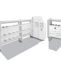 Designed for plumbers and cable/telecom installers, the WEATHER GUARD Model 600-8412L van package for High-Roof, 148in wheel base Ford Transit vans provides adjustable cargo van shelving sized to fit the commercial van interior, a shelf door, a 5 drawer secure storage cabinet, and accessories. It includes a sturdy van bulkhead for maximum protection against shifting loads. Additional van products are available to create a custom van storage solution.