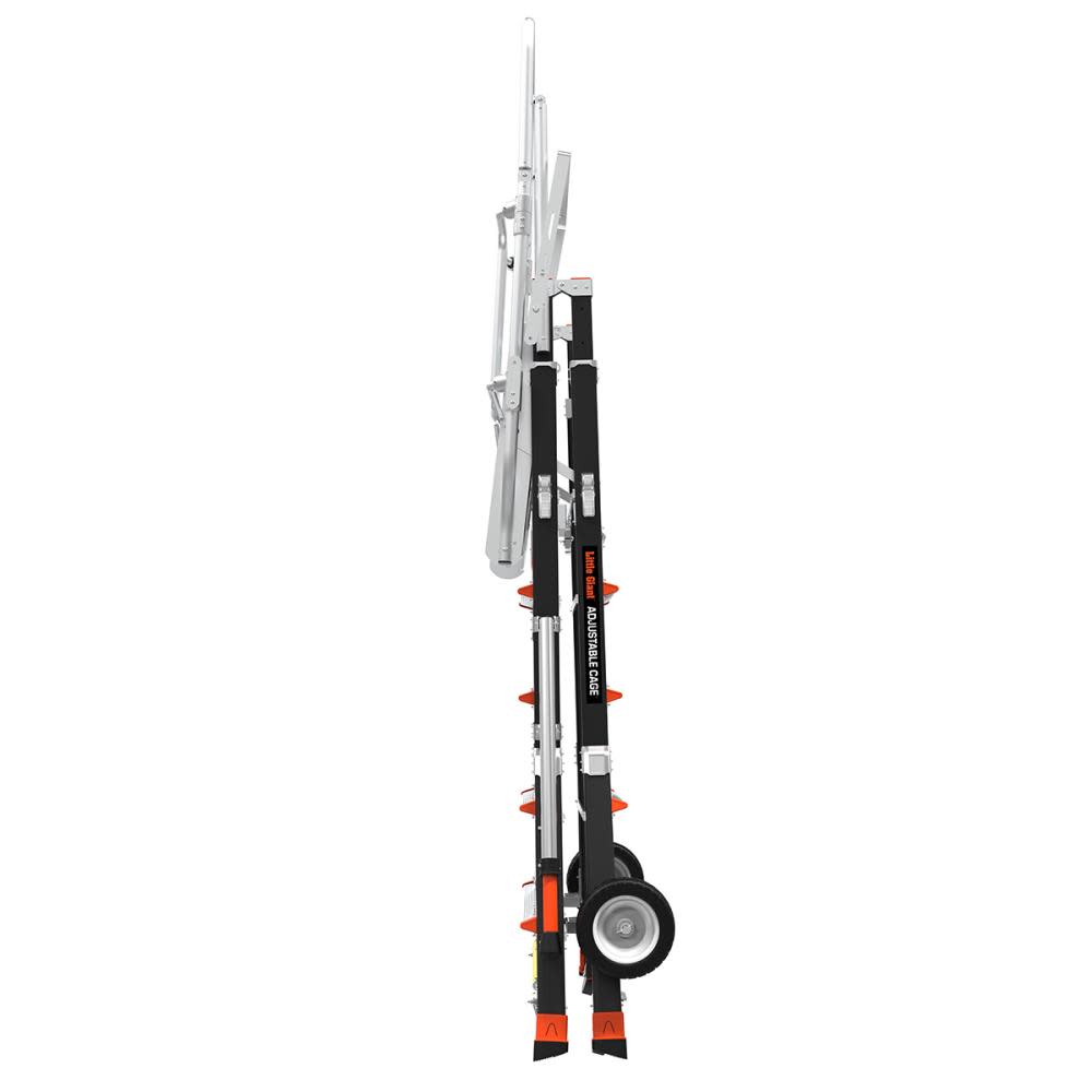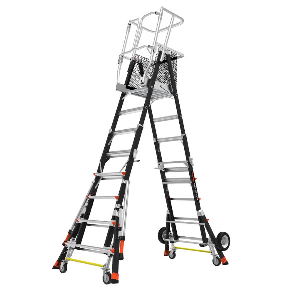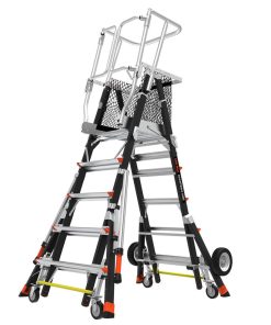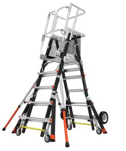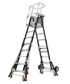 In many industries, company rules require professionals working at heights to tie off to a suitable anchor point before they can work with both hands. In some circumstances, these standards are often difficult or even impossible to keep, and often result in operators working in unsafe positions. And sometimes professionals are compelled to use expensive, time-consuming scaffolding systems. The Little Giant adjustable Safety Cage? is a versatile, safe alternative to tying off, and a much faster, much more inexpensive alternative to many scaffolding applications. The Cage is constructed of non-conductive, high-strength fiberglass-resin composite. The Cage is fully adjustable in one-foot increments, allowing the operator to adjust the platform height to the job at hand. Each side adjusts independently, so operators can also use the Cage over uneven surfaces or stairs, where a mechanical lift or ordinary stepladder could never go. And the Cage protects operators in a fully enclosed working platform, allowing them to work safely and quickly with two hands while complying with industry regulations. Time- and energy-saving Tip & Glide? wheels make it quick and easy to move from job to job. The Cage is also available with Wheel Lift? Casters that allow you to easily move the Cage from place to place while fully deployed.