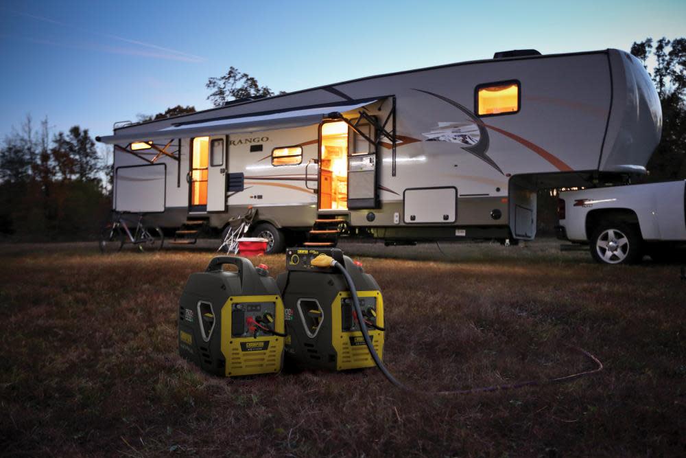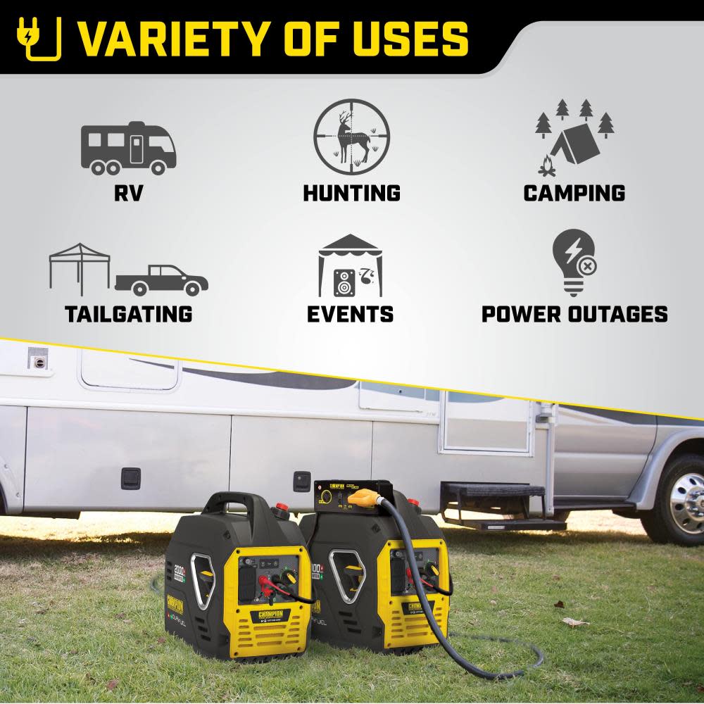 The Champion Power Equipment 200959 2000-Watt Portable Inverter Generator is ideal for camping or tailgating. Weighing in at an ultralight 39 pounds, this model is one of the lightest 2000-watt inverters in the industry. Thanks to Champion??s innovative design, power on the go has never been easier. Power up with the reliable recoil start, plus Cold Start Technology ensures a quick start in cold weather. Included are two covered 120V 20A household outlets (5-20R) plus two handy 2.1A USB ports you can use to power your phone, laptop, or similar device. This inverter operates at 53 dBA from 23 feet ?C about the same noise level as a dishwasher. Operate your Dual-Fuel generator right out of the box on gasoline or propane, and easily switch fuels with the fuel selector dial. When the 1.05-gallon tank of gasoline is full, the 79cc Champion engine produces 2000 starting watts and 1700 running watts and will run for up to 11.5 hours at 25% load. When using a 20-pound propane tank, it produces 2000 starting watts and 1530 running watts and will run for up to 34 hours at 25% load. Connect this Parallel Ready inverter with another Champion 2000-watt inverter for 30 amps of power. The optional parallel kit (sold separately) allows you to integrate two inverters, plus the kit has a standard 30A RV outlet and a 120V 30A locking outlet. Confidently connect your sensitive electronics since this inverter produces Clean Power (< 3% THD). Designed for safety with a low oil shut-off sensor, this model has a 0.5-quart oil capacity (included 10W-30). Champion??s Inverter Technology includes smart Economy Mode, which can reduce the electrical load. Fully assembled with hassle-free setup, the built-in carrying handle makes transport a cinch. Buy this EPA certified and CARB compliant generator with confidence ?C Champion Support and our nationwide network of service centers will back up your purchase with a 3-year limited warranty and FREE lifetime technical support.