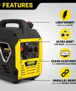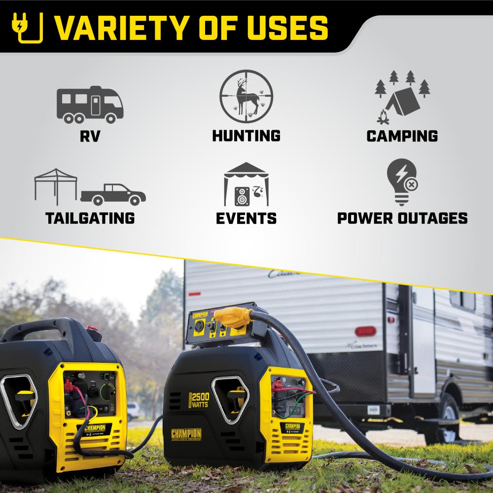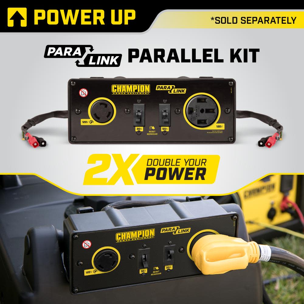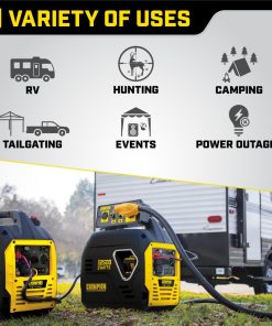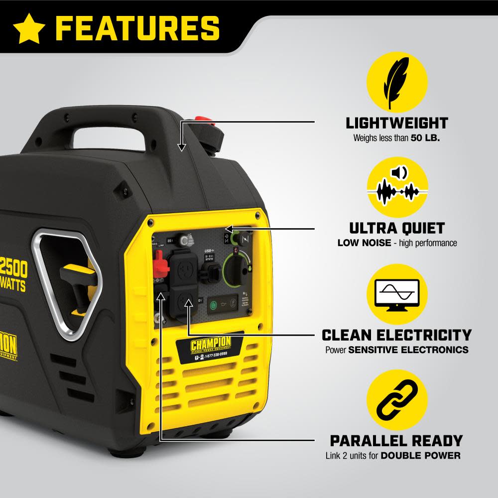 The Champion Power Equipment 200950 2500-Watt Portable Inverter Generator is ideal for camping, tailgating, powering items around the RV or providing backup for a few basics. This unit is not recommended for emergency home backup. Weighing in at an ultralight 39 pounds, this model is under 40 lbs and is one of the lightest 2500-watt inverters in the industry. Thanks to Champion??s innovative design, power on the go has never been easier. Power up with the reliable recoil start, plus Cold Start Technology ensures a quick start in cold weather. Included are two covered 120V 20A household outlets (5-20R) plus two handy 2.1A USB ports you can use to power your phone, laptop, or similar device. This inverter operates at 53 dBA from 23 feet ?C about the same noise level as a dishwasher running in the next room. Using gasoline, the 79cc Champion engine produces 2500 starting watts and 1850 running watts. When the 1.1-gallon tank of gasoline is full, this inverter will run up to 11.5 hours at 25% load. Connect this Parallel Ready inverter with another Champion 2500-watt inverter for 30 amps of power. If you purchase the optional clip-on parallel kit which is sold separately (not included), you can integrate two inverters, plus the kit has a standard 30A RV outlet and a 120V 30A locking outlet. Confidently connect your sensitive electronics since this inverter produces Clean Power (< 3% THD). Designed for safety with a low oil shut-off sensor, this model has a 0.5-quart oil capacity. Champion??s Inverter Technology includes smart Economy Mode, which can reduce the electrical load, providing quieter operation, extended engine life and better fuel economy. Champion Support and our nationwide network of service centers will back up your purchase with a 3-year limited warranty and FREE lifetime technical support.
