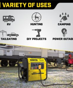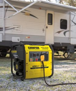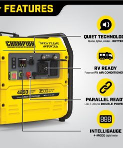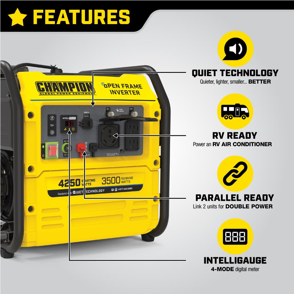 The Champion Power Equipment 4250-Watt Open Frame Inverter Generator is one of the most innovative products on the market. We created an efficient mechanical design to decrease the overall footprint and weight by 20 percent. A quiet, lightweight addition to your RV and a cost-effective power solution, this inverter generator is smaller, quieter, lighter??BETTER! Champion??s recoil start features Cold Start Technology, plus the reliable 224cc Champion engine produces 4250 starting watts and 3500 running watts, and runs for 22 hours at 25% load when the 4-gallon fuel tank is full. With a 0.6-quart oil capacity (included 10W-30) and a low oil shut-off sensor, this inverter operates at 64 dBA from 23 feet, which is a bit louder than normal speech. Confidently connect your sensitive electronics since this inverter produces Clean Power (less than 3% THD). Our Quick Touch Panel offers fast access to all your controls. The Intelligauge monitors voltage, frequency and operating hours with ease, while Economy Mode monitors power consumption in real time to reduce electrical load. As the electrical load is reduced, the engine idles lower, providing quieter operation, extended engine life and higher fuel economy. The covered outlets in this RV Ready inverter include a 120V 30A RV (TT-30R), two 120V 20A household outlets (5-20R) plus two handy 2.1A USB ports you can use to power your phone, laptop, or similar device. The optional Parallel Kit (sold separately), with included standard 50-amp RV outlet, provides a clip-on connection which allows you to increase output by connecting up to two 2800-watt or higher inverters or digital hybrids. Buy this fully assembled CARB compliant generator with confidence ?C Champion Support and our nationwide network of service centers will back up your purchase with a 3-year limited warranty and FREE lifetime technical support.