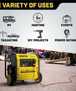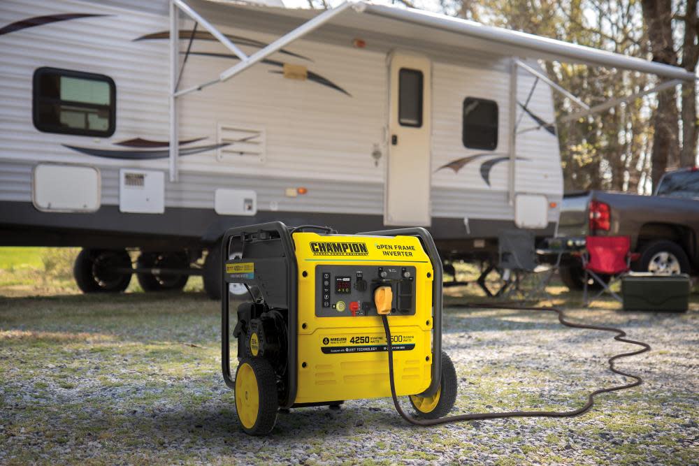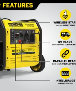The Champion Power Equipment 4250-Watt Open Frame Inverter Generator is one of the most innovative products on the market. Our advanced technology and innovative design will improve the way you power your life. Starting and stopping your generator from up to 80 feet away with the wireless remote key fob is a snap. First, we cut the noise level in half by integrating Quiet Technology digital components used in more advanced inverters. Then, we created an efficient mechanical design to decrease the overall footprint and weight by 20 percent. A quiet, lightweight addition to your RV and a cost-effective power solution, this Open Frame Inverter is smaller, quieter, lighter??BETTER! Champion??s recoil start features Cold Start Technology, plus the reliable 224cc Champion engine produces 4250 starting watts and 3500 running watts, and runs for 22 hours at 25% load when the 4-gallon fuel tank is full. With a 0.6-quart oil capacity (included 10W-30) and a low oil shut-off sensor, this inverter operates at 64 dBA from 23 feet, which is a bit louder than normal speech. Confidently connect your sensitive electronics since this inverter produces Clean Power (less than 3% THD). Our Quick Touch Panel offers fast access to all your controls. The Intelligauge monitors voltage, frequency and operating hours with ease, while Economy Mode monitors power consumption in real time to reduce engine wear and tear. As the electrical load is reduced, the inverter reduces engine speed, providing quieter operation, extended engine life and higher fuel economy. The covered outlets in this RV Ready inverter include a 120V 30A RV (TT-30R), two 120V 20A household outlets (5-20R) plus two convenient USB ports you can use to power your phone, laptop, or similar device. Buy this CARB compliant generator with confidence ?C Champion Support and our nationwide network of service centers will back up your purchase with a 3-year limited warranty and FREE lifetime technical support.