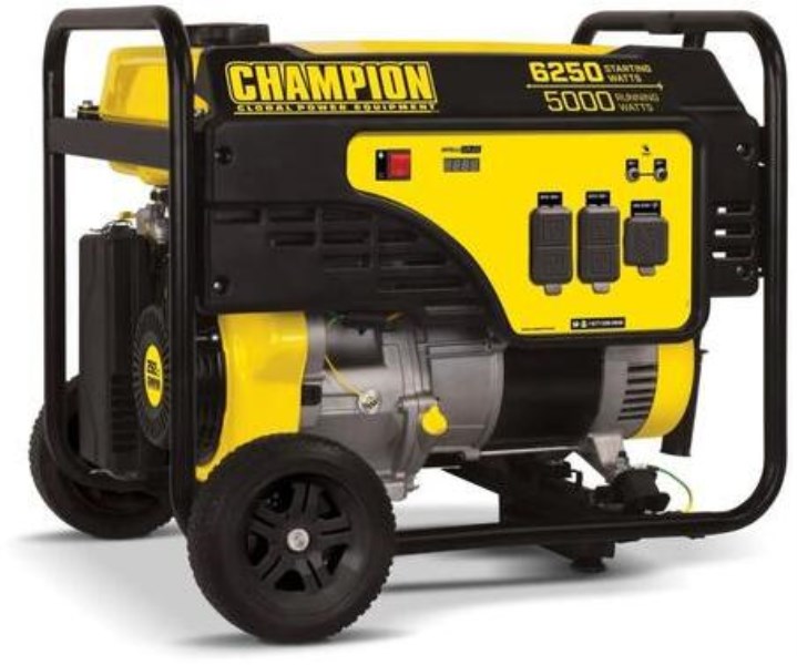 5000-watt portable generator featuring a great combination of versatility and convenience. Ideal for use on a weekend project or wherever you might need additional power, this generator can also provide plenty of back-up power for your essentials during an outage. Features a reliable recoil start, plus Cold Start Technology to ensure a quick start in cold weather. Designed for safety with convenient push-to-reset circuit breakers, a low oil shut-off sensor plus an included oil funnel for easy changes, this unit includes 1.2-quarts of recommended 10W-30 engine oil. The reliable 292cc single-cylinder OHV Champion engine produces 6250 starting watts and 5000 running watts, and will run for up to 9 hours at 50% load when the 5.7-gallon tank of gasoline is full. Easily monitor power output and track maintenance intervals with Intelligauge, which allows you to keep track of voltage, frequency and operating hours. With a noise level of 74 dBA from 23 feet, which is a bit louder than a vacuum cleaner, this machine can handle most essentials in an outage. All the outlets have covers for protection and include (1) 120/240V 30A locking outlet (L14-30R) and (4) 120V 20A GFCI (ground fault circuit interrupter) protected household outlets (5-20R). Volt Guard built-in surge protector prevents overloads and keeps your equipment safe from spikes in voltage. Includes clear directions that makes set-up hassle free. The foldaway handle installs easily with no tools necessary, while the included wheel kit with never flat tires makes it a cinch to move your power where you need it. EPA (Environmental Protection Agency) certified and CARB (California Air Resources Board) compliant. 3-year limited warranty and free lifetime technical support.