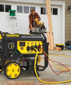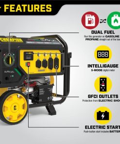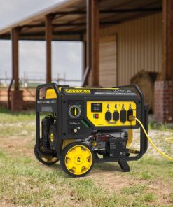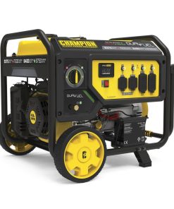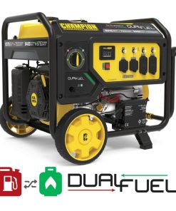 The Champion Power Equipment 100891 7500-Watt Dual Fuel Portable Generator is the perfect combination of versatility and convenience. Whether you need power for your home or next project, Champion Power Equipment makes powering your life more convenient than ever. The convenient electric start includes a battery, plus Cold Start Technology ensures a quick start in cold weather. Designed with a low oil shut-off sensor, this unit includes 1.2-quarts of 10W-30 oil. Operate your Dual-Fuel generator right out of the box on gasoline or propane, and easily switch fuels with our patented fuel selector switch that allows for safe switching between fuel sources. Using gasoline, the 439cc Champion engine produces 9375 starting watts and 7500 running watts, and will run for 10 hours at 50% load when the 7.7-gallon fuel tank is full. It produces 8400 starting watts and 6750 running watts, and will run for 5.5 hours at 50% load when using a 20-pound propane tank. Also included is a 6-foot propane hose with a built-in regulator. With a noise level of 74 dBA from 23 feet, which is a bit louder than a vacuum, this machine can provide home backup in an outage, plus the Volt Guard protects your generator from electrical voltage spikes. Plenty of outlets are available, with a 120V 30A locking outlet (L5-30R), a 120/240V 30A locking outlet (L14-30R) as well as four 120V 20A GFCI protected household outlets (5-20R). Champion??s thoughtful packaging and clear directions make setup hassle free, plus the foldaway U-shaped handle makes it easy to store, while the never-flat tires in the included wheel kit make transport a cinch. Buy this EPA certified and CARB compliant generator with confidence ?C Champion Support and our nationwide network of service centers will back up your purchase with a 3-year limited warranty and FREE lifetime technical support.