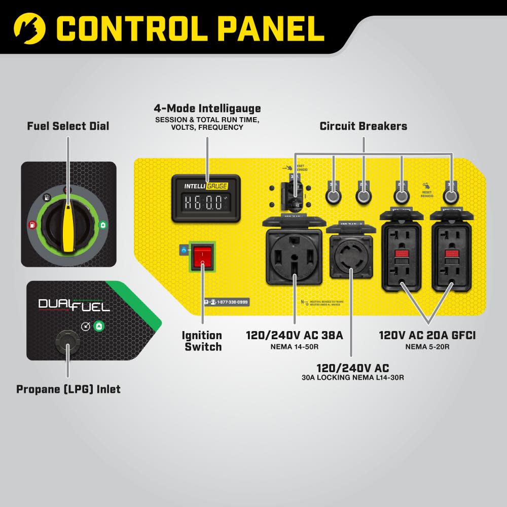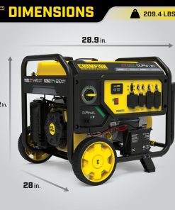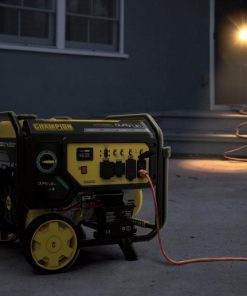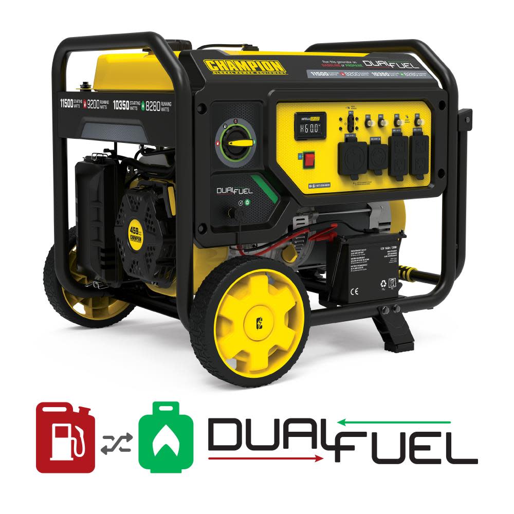 The Champion Power Equipment 201194 9200-Watt Dual Fuel Portable Generator is the perfect combination of versatility and convenience. Whether you need power for your home or next project, Champion Power Equipment makes powering your life more convenient than ever. The convenient electric start includes a battery, plus Cold Start Technology ensures a quick start in cold weather. Easily monitor power output and track maintenance intervals with Intelligauge, which allows you to keep track of voltage, frequency and run-time hours. Designed with a low oil shut-off switch, this unit includes 1.2-quarts of 10W-30 oil. Operate your Dual-Fuel generator right out of the box on gasoline or propane, and easily switch fuels with our patented fuel select dial that allows for safe switching between fuel sources. Using gasoline, the 459cc Champion engine produces 11,500 starting watts and 9200 running watts, and will run for 10 hours at 50% load when the 7.7-gallon fuel tank is full. It produces 10,350 starting watts and 8280 running watts, and will run for 5 hours at 50% load when using a 20-pound propane tank. Also included is a 6.5-foot propane hose with a built-in regulator. With a noise level of 74 dBA from 23 feet, which is a bit louder than a vacuum, this machine can provide home backup in an outage, plus the Volt Guard? protects your generator from electrical voltage spikes. All the outlets have covers for protection and include 120/240V 30A locking outlet (L14-30R), a 120/240V 38A outlet (L14-50R) as well as two 120V 20A GFCI protected household duplex outlets (5-20R). Buy this EPA certified and CARB compliant generator with confidence ?C Champion Support and our nationwide network of service centers will back up your purchase with a 3-year limited warranty and FREE lifetime technical support.