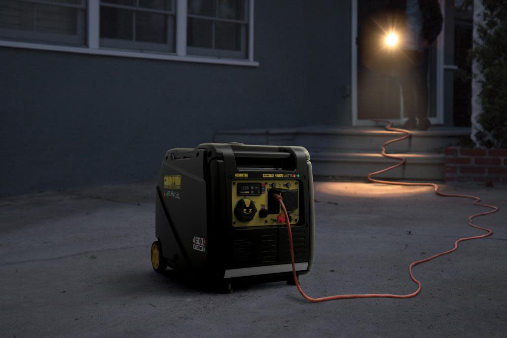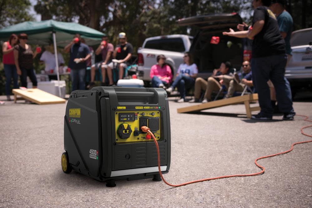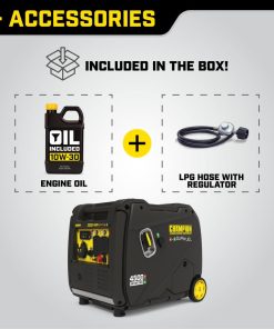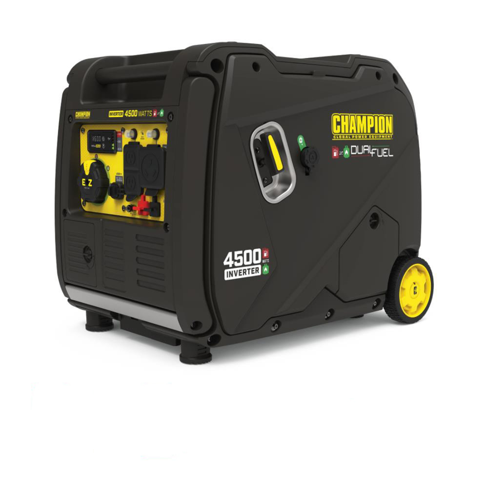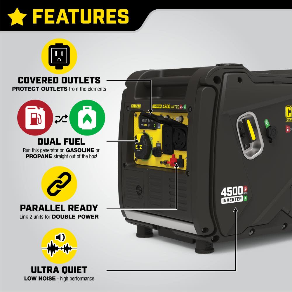 The Champion Power Equipment 4500-Watt Inverter Generator is ultra-quiet and ideal for camping, tailgating, powering items around the RV or providing backup for your essentials. Champion??s EZ Start Dial makes getting started quick and easy. Featuring Cold Start Technology, Extended Run Time, and an easy to read fuel gauge. With a 0.5-quart oil capacity (included 10W-30) and a low oil shut-off sensor, this inverter operates at an ultra-quiet 61 dBA from 23 feet, which is about as loud as normal speech. The no tool access panel and oil drain tube allow for easy maintenance. Confidently connect your sensitive electronics since this inverter produces Clean Power (less than 3% THD). Operate your Dual-Fuel generator right out of the box on gasoline or propane, and easily switch fuels with the EZ Start dial. When the 2.3-gallon tank of gasoline is full, the 212cc Champion engine produces 4500 starting watts and 3500 running watts and will run for up to 14 hours at 25% load. When using a 20-pound propane tank, it produces 4500 starting watts and 3150 running watts and will run for up to 21 hours at 25% load. The covered outlets in this RV Ready inverter include a 120V 30A RV (TT-30R), two 120V 20A household outlets (5-20R), and dual USB outlets (5V DC, 2.1A). The optional Parallel Kit (sold separately), with included standard 50-amp RV outlet, allows you to increase output by connecting up to two 3500-watt or higher inverters. The never flat tires and fold-down handle make transport a cinch. Buy this EPA certified and CARB compliant generator with confidence ?C Champion Support and our nationwide network of service centers will back up your purchase with a 3-year limited warranty and FREE lifetime technical support.