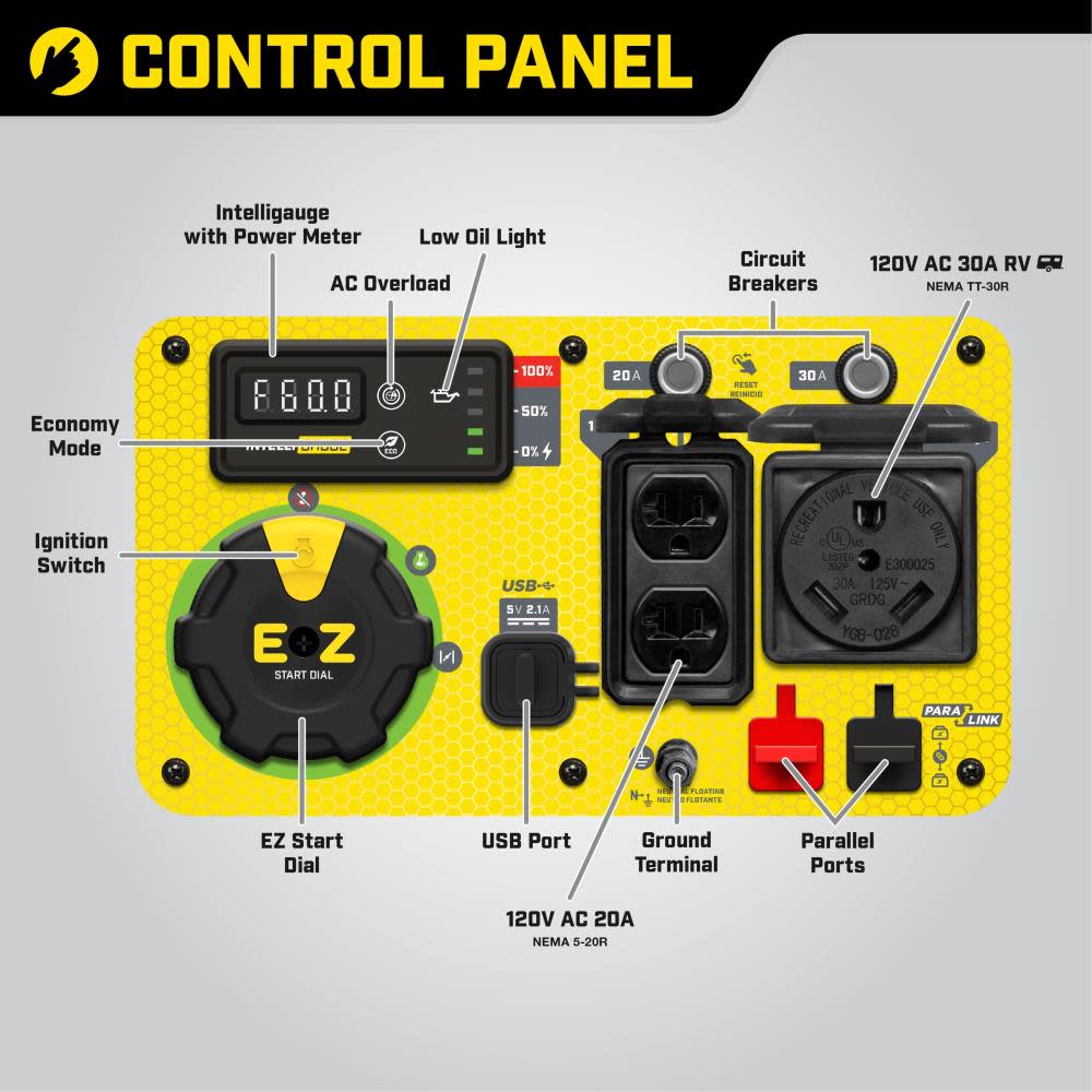 Monitor voltage, frequency and operating hours with ease, plus the EZ Start Dial simplifies startup while Economy Mode monitors power consumption in real time