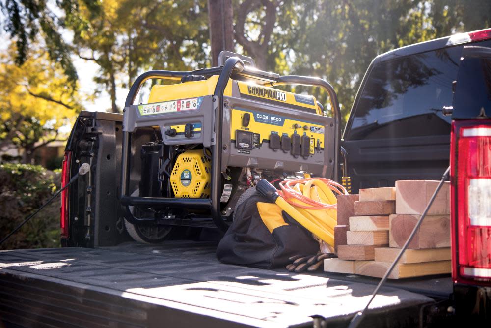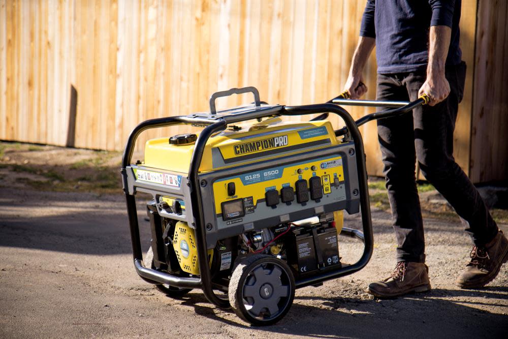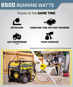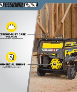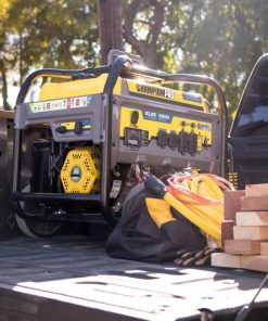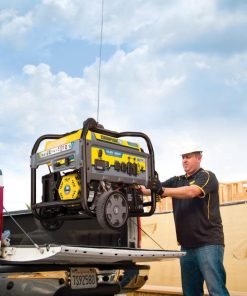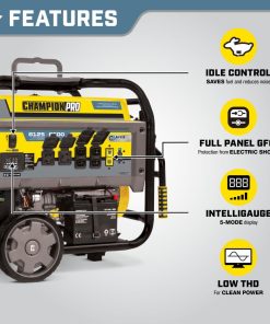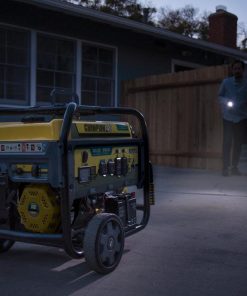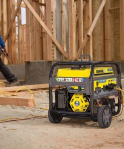 The long-lasting 389cc Champion commercial-grade engine with electric start produces 8125 starting watts and 6500 running watts for up to 12.5 hours of run time on a full tank of gasoline with a noise level of 74 dBA from 23 feet