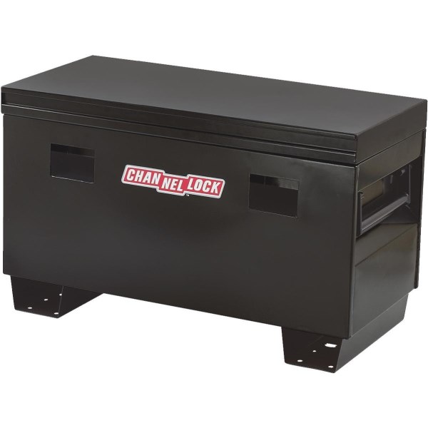 Rugged and secure steel tool storage box perfect for the construction job site and industrial applications. Box has fold down side handles and lock. Can be secured to stationary objects for extra security. 20-gauge steel construction with 12-gauge steel feet. Powder-coated finish.