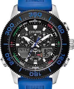 Citizen Eco-Drive Promaster Skyhawk 44mm Chronograph Watch w/ Black Dial & Blue Polyurethane Strap, Model JR4068-01EFor avid marine sportsmen who value style as much as function, Citizen??s Promaster Sailhawk with Eco-Drive technology is the perfect combination of the two. With a blue polyurethane strap and numbering detail, offset with a stainless steel case, black aluminum bezel and dial, this watch isn??t blending into the background. And with features such as a yacht racing timer, a 99-minute countdown timer, two separate alarms, split lap times, the ability to show the time in 30 cities worldwide, and water resistance up to 200 meters, there is no water-based activity this timepiece can??t handle with ease. Features Movement Technology