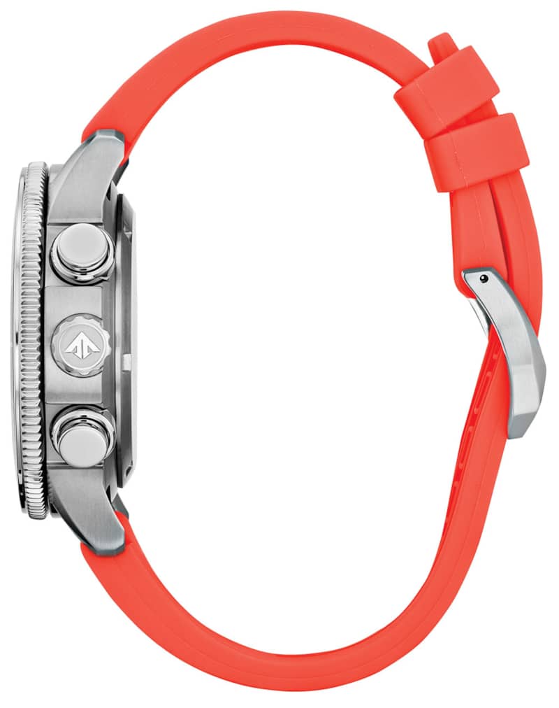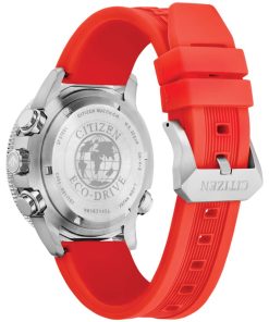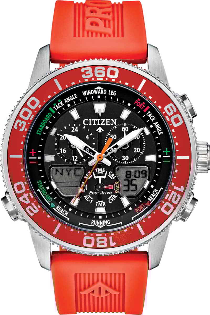 Citizen Eco-Drive Promaster Skyhawk 44mm Chronograph Watch w/ Black Dial & Orange Polyurethane Strap, Model JR4061-00FThis eye-catching Promaster Sailhawk with a bright orange polyurethane strap from Citizen is sure to turn heads. The timepiece isn??t just stylish, however ?? it is packed with features, such as Eco-Drive technology so it will never run out of power, the ability to give the time in 30 cities worldwide, a yacht racing timer, split lap time, a 99-minute countdown timer, and two different alarms. And with a stainless steel case and water resistance up to 200 meters, this colorful watch is essential for every avid marine sportsman. Features Movement Technology