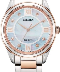 Citizen Eco-Drive Arezzo 32mm Watch w/ White Mother-Of-Pearl Dial & Two-Tone Silver/Pink Gold-Tone Ion-Plated Stainless Steel Bracelet, Model EM0876-51DThe Arezzo from Citizen is a feminine timepiece that will work hard as it looks great. The two-tone, pink gold stainless-steel 32mm case and two-tone pink gold stainless-steel bracelet are offset with a white mother of pearl dial with Roman numerals and inset diamonds for the perfect touch of elegance. The slightly oversized profile is easy to wear and easy to use, making it as functional as it is beautiful. And with Eco-Drive technology, it is powered by light and will always be ready when you are. Features Movement Technology