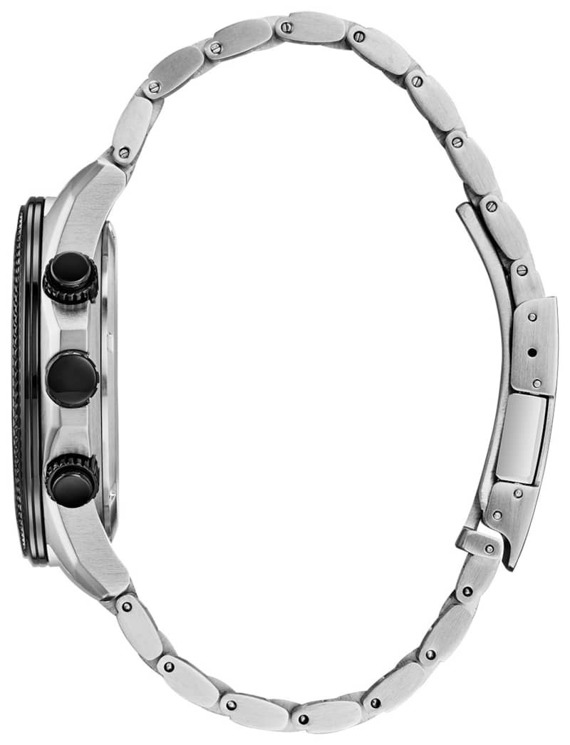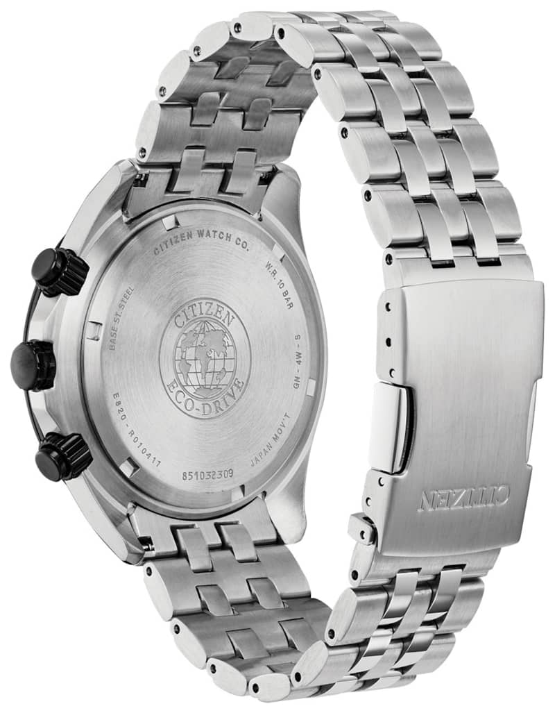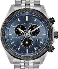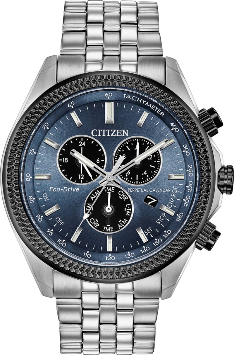 Citizen Eco-Drive Classic 44mm Chronograph Watch w/ Blue-Grey Dial Silver-Tone Stainless Steel Bracelet, Model BL5568-54LTaking it up a notch with the reinvented Citizen Perpetual Calendar Chrono timepiece with a 1/20 second chronograph, perpetual calendar and dual time in a stainless steel case and bracelet completed with a blue-gray dial. Featuring our Eco-Drive technology ?C powered by light, any light. Never needs a battery. Caliber number E820. Features Movement Technology