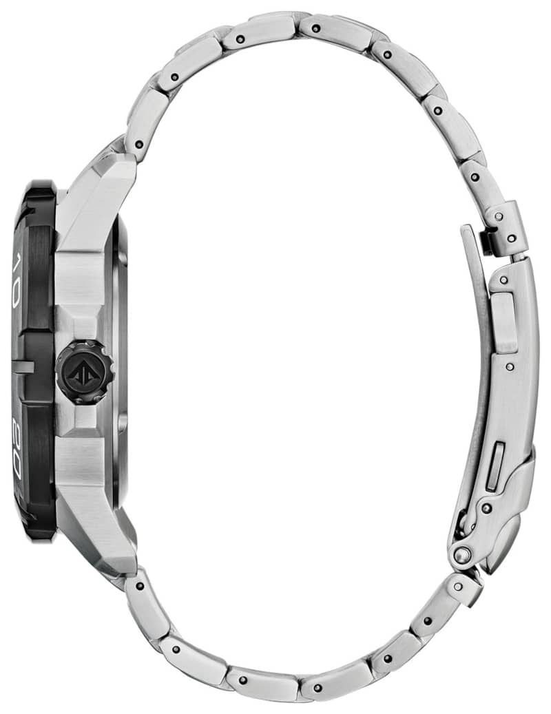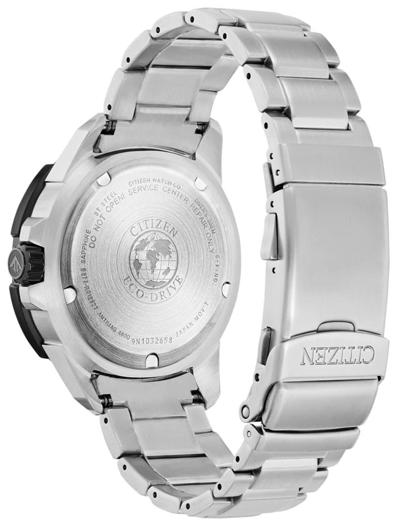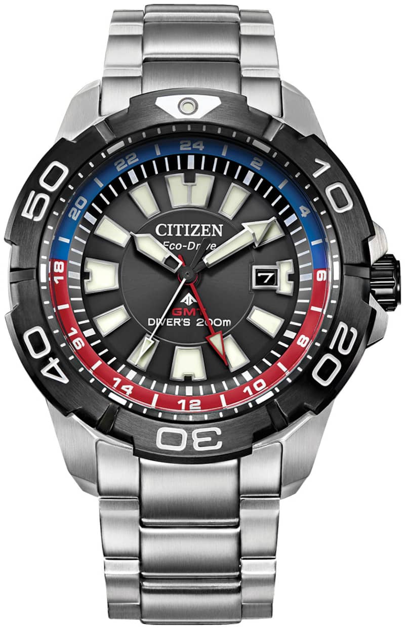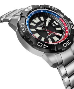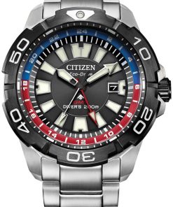 Citizen Eco-Drive Promaster GMT 44mm Watch w/ Black w/ Red Accents Dial Silver-Tone Stainless Steel Bracelet, Model BJ7128-59EA fully-featured dive watch with a splash of color, the Promaster GMT Diver with Eco-Drive technology from Citizen is the total package. The stainless steel band and black dial are accented with red and blue for a bold look that stands out from the crowd. This timepiece features an anti-reflective sapphire crystal face, dive grade luminous hands and markers, anti-shock, anti-magnetic, dual time and a rotating bezel. Features Movement Technology