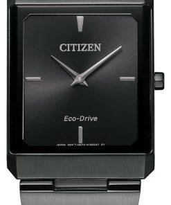 Citizen Eco-Drive Stiletto 28mm x 38mm Watch w/ Black Dial & Black Ion-Plated Stainless Steel Bracelet, Model AR3107-57EThe bold square style of the Large Stiletto Tank is a timepiece not to be missed. The black stainless steel band and case and black dial makes for a sleek package. This watch capitalizes on Citizen??s long history of designing fine, slim timepieces with a case just 5.06mm (+/- .25mm) thick, for a comfortable fit for anyone who puts it on. With Eco-Drive technology and a unisex aesthetic, this sophisticated watch also features a jewelry-style clasp that lays completely flat against the arm. This is truly a watch that can??t be missed. Features Movement Technology