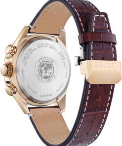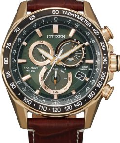 Citizen Eco-Drive PCAT 43mm Chronograph Watch w/ Green Dial & Brown Leather Strap, Model CB5919-00XThe PCAT from Citizen is a must-have timepiece for any enthusiast. Additional features include atomic timekeeping with synchronized time adjustment in 43 cities worldwide, Eco-Drive technology, perpetual calendar, power reserve indicator and a chronograph. It has a brown leather strap and 43mm rose-gold tone stainless-steel case with a stylish green dial. For anyone looking to blend timelessness with technology, this watch will hit all the buttons. Features Movement Technology