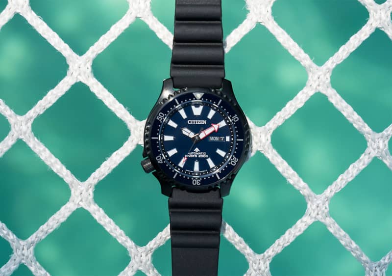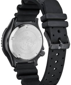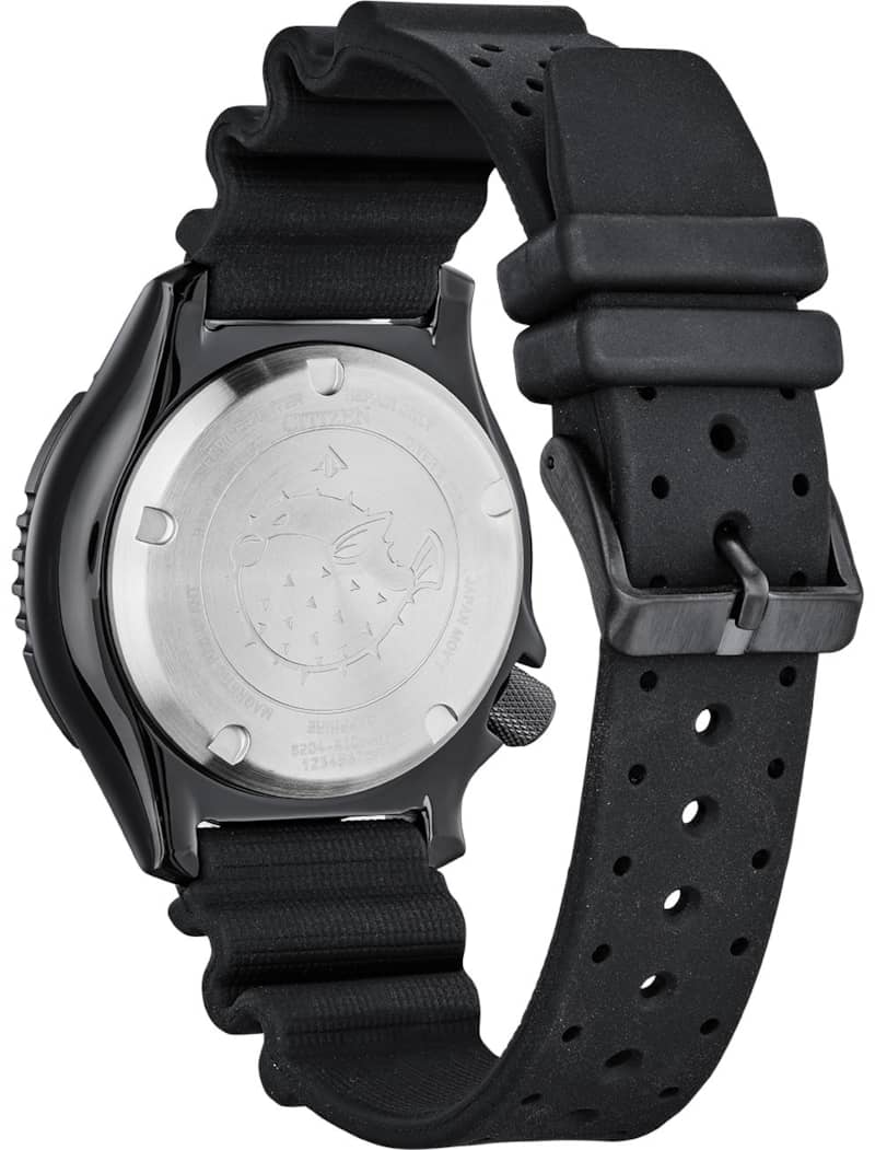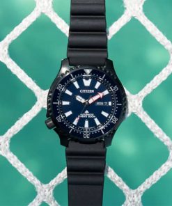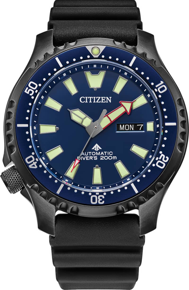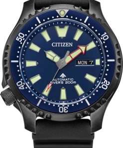 Citizen Promaster Dive Automatic 44mm Watch w/ Blue Dial & Black Polyurethane Strap, Model NY0158-09LGive a nod to the past with the new Promaster Automatic Dive men??s watch by Citizen. Going deeper into the history of the original version of this diving watch, it was used by the Italian Navy and released in 1989 for the new generation of dive watch enthusiasts. Featuring 3-piece, 44mm case, anti-reflective sapphire crystal and black polyurethane strap, the dark blue rotating bezel with a black easy grip aluminum ring surrounds the dark blue dial and luminous hands and markers, while the case back features an engraving of a ??Fugu??, Japanese for ??pufferfish??. This technically advanced and automatic sport watch comes in an exclusive collector??s dive tank box and is ISO compliant with a screw-down crown and water resistant to 200 meters. Caliber 8204. Features Movement Technology