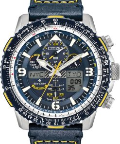 Citizen Promaster Skyhawk A-T 45mm Chronograph Watch w/ Blue Dial & Indigo Italian Leather Strap, Model JY8078-01LThe Blue Angels are the Navy’s elite flight demonstration squadron renowned for their precision and grace showcased in each of their flight maneuvers. This precision and grace is exhibited in the CITIZEN Promaster Blue Angels Skyhawk A-T with precise atomic timekeeping in 43 cities. Other features include a chronograph, perpetual calendar, dual time, alarms, countdown timer, digital backlight and UTC display, power reserve and pilot’s rotating slide rule bezel. This model appears in a stainless steel case, indigo blue italian leather strap with yellow contrast stitching, yellow accented dark blue dial and bezel with the Blue Angel’s insignia replicated on the caseback. Featuring our Eco-Drive technology ?C powered by light, any light. Never needs a battery. Caliber number U680. Features Movement Technology