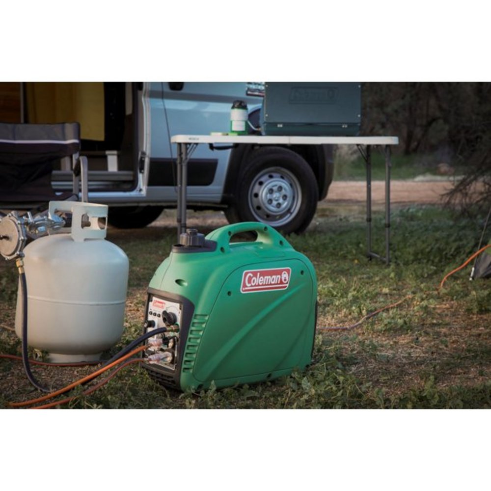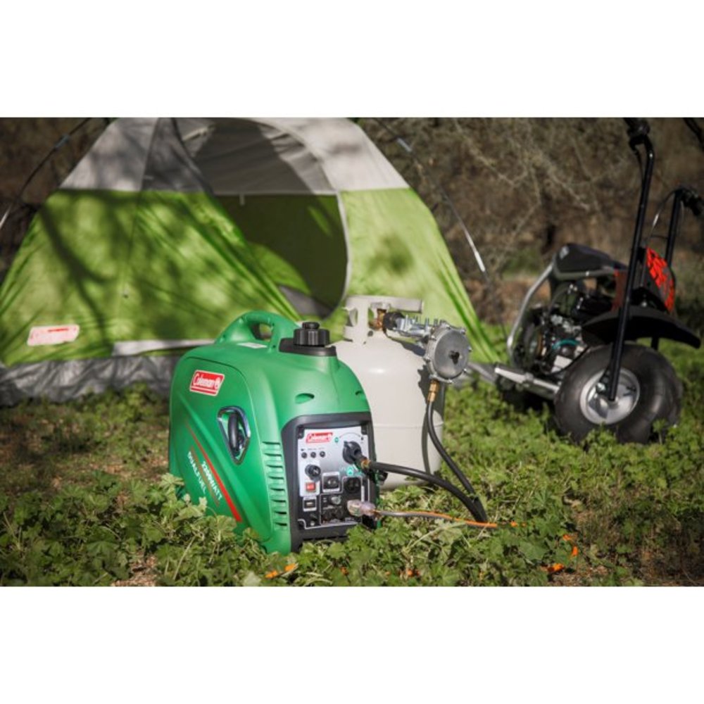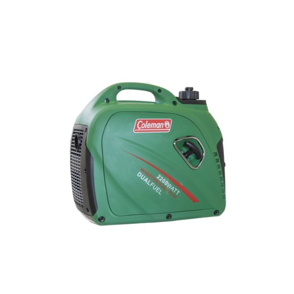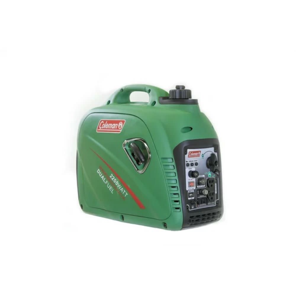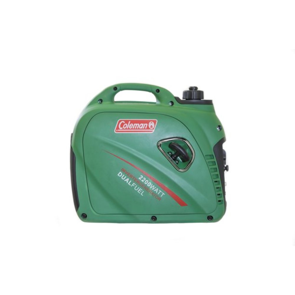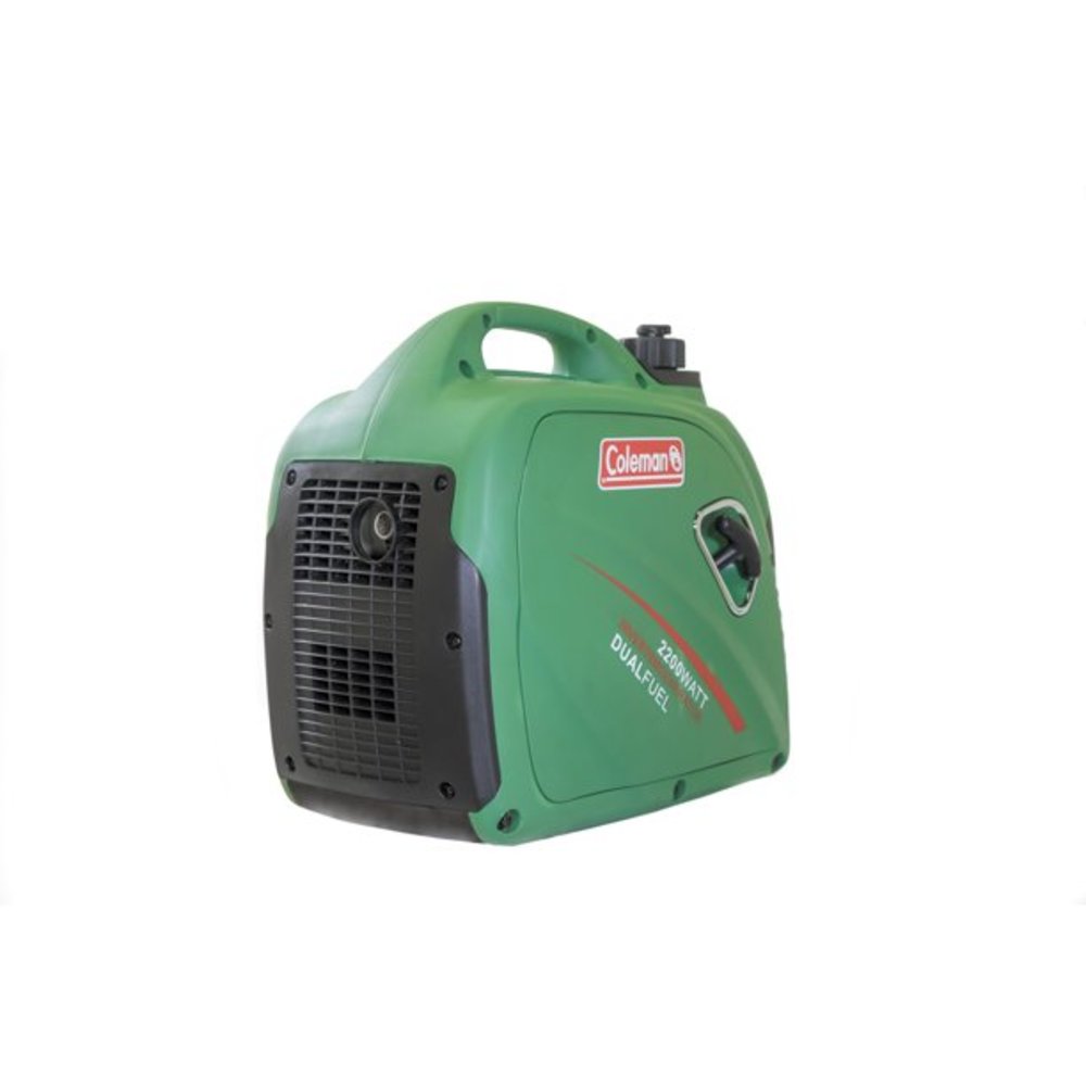 Introducing the New Coleman’s Dual Fuel DF220 2200W Inverter Generator, a portable and efficient generator that will fit many of your power needs. Its single cylinder, 4-stroke, OHV Air-Cooled engine delivers clean power up to 2,200 peak watts/1,800 running watts. With parallel capabilities, it is easy to connect two DF220 generators to increase power output while still having the advantage of carrying around a smaller unit. Having the benefit of dual fuel allows the generator to be powered by either unleaded gasoline or propane, making it perfect for your family??s outdoor adventure, as well as in case of emergencies. Whether charging your cell phone, or keeping your refrigerator running, Coleman??s DF220 generator will keep you going when the grid can??t.