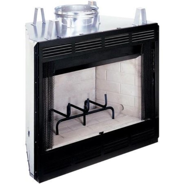42″ builders woodburning firebox. Firebox includes heat circulating louvers, cast-iron grate, wire mesh screen in hidden screen pockets, and a full brick liner. Approved for use as a wood burning fireplace or for use with vented gas log sets, or vent free gas logs. Accessory hood and FMI venting pipe must be installed when using vent-free logs. Approximate product dimensions: 48″ W. x 44-1/2″ H. x 22-1/2″ D. IHP venting pipe must be installed, which have been designed to fit and tested for this fireplace system.